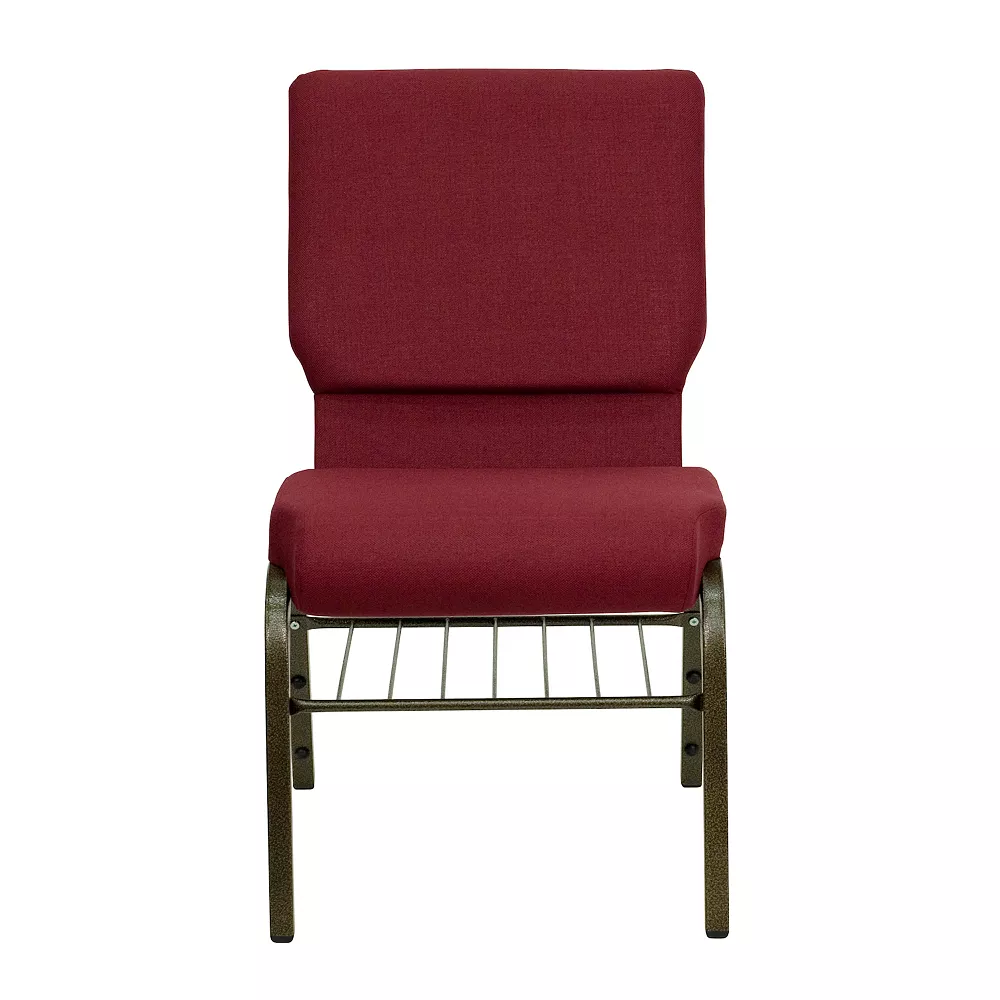 This beautiful church chair will keep your guests supremely comfortable whether you’re hosting an all-day seminar, serving a 10 course meal or delivering your most inspirational sermon. This chair offers an advantage over pew seating with the flexibility of creating different seating configurations. The chair’s cushioned back and 4 thick seat are generously padded and covered in durable fabric upholstery. The seat has a waterfall edge that reduces pressure on your attendees’ legs. A convenient book pouch on the back of the chair keeps seminar materials, bibles or hymn books readily available and a book rack under the seat gives everyone a place to store their personal belongings. Built-in ganging brackets connect your chairs and maintain nice, straight rows. Its sturdy 16 gauge steel, gold vein frame, with gracefully angled legs, has been tested to hold up to 800 pounds and plastic rocker glides protect your floor by sliding smoothly when you need to move the chair. This Church Chair is an excellent option for hotel lobbies, banquet halls, conference facilities and worship centers.