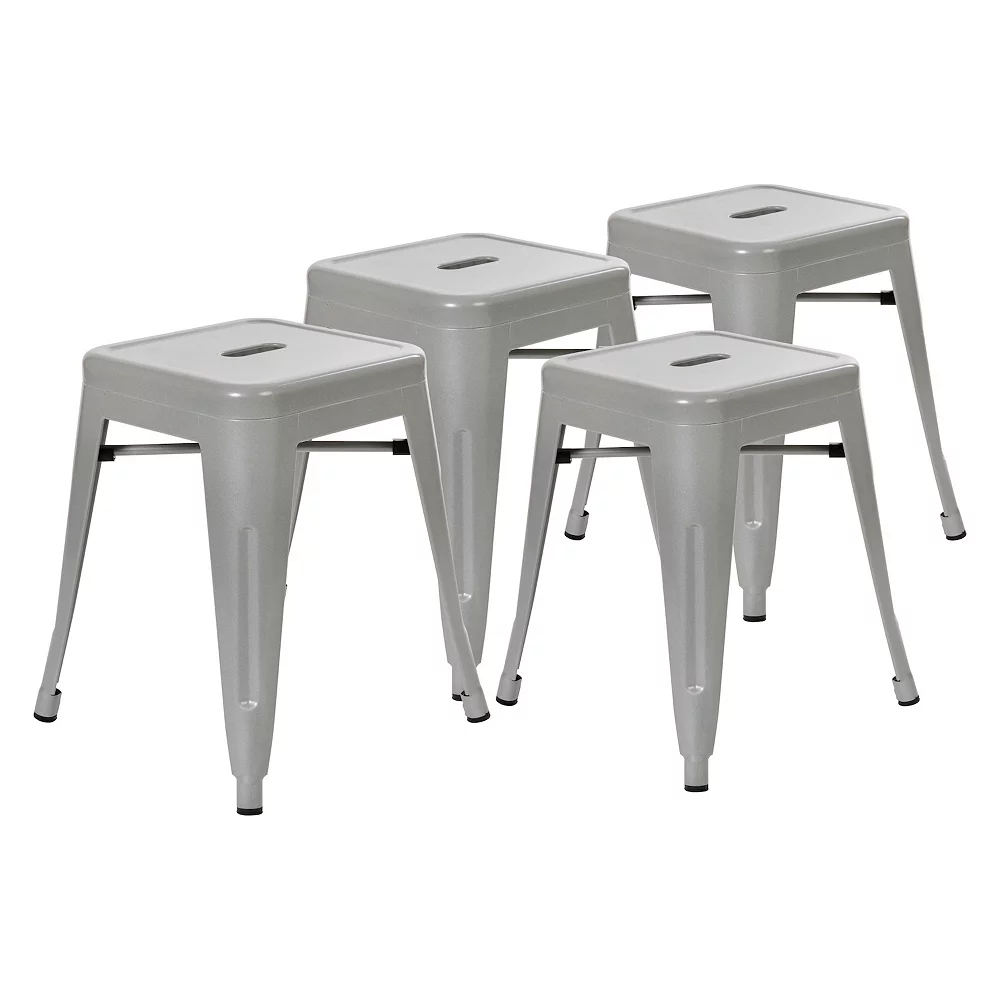 Give your kitchen or dining room an instant revamp when you choose the on-trend square shape of this set of 4 indoor metal kitchen table height stools. The streamlined silhouette of this short bar stool allows it to tuck under your dining room, cafe, or restaurant table to open up floor space. Great for small spaces like breakfast nooks, apartments or the corner bistro, the backless design gives an unobstructed view of your room for more visual space. Whether you’re furnishing your home or business, a quality product is number one on your must-have list. Featuring welded construction with under seat bracing and created from 1 inch thick iron, this table stool will be a long-lasting addition to any space. This dining height stool has fixed rubber floor glides that will prevent damage to your hard flooring surfaces and is stackable up to 10 high for storage or routine cleaning. Easy clean up makes this standard height stool ideal for breakroom and lunchroom seating. Simply wipe clean with water followed by a dry cloth to maintain great looks. These dining chairs arrive fully assembled and ready to use for your convenience. Choose from an array of colors to match any decor.
