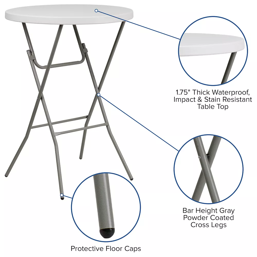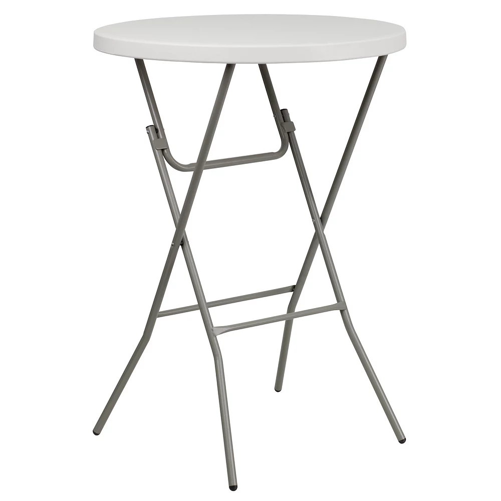 Host mixers at your venue for Wednesday Wind Down, make it a social setting incorporating these bar height cocktail tables. These pub tables encourage everyone to stand around and mingle as your mixologist serves up delicious signature drinks to keep people coming back to your lounge. During events mix folding bar tables with round table height tables for variation. When you invite friends over to your backyard bash this cocktail table is perfect for socializing or grabbing snacks poolside. This table can comfortably seat up to 3 adults to enjoy friendly conversation. Let the birthday girl shine at her own table while everyone sits at table height tables. The legs fold flat to transport and store away. These event tables are a must have for your event rental business or banquet hall to add variety to your seating. Although designed for indoor events this party table can be used outdoors on the deck or patio during good weather but must be stored indoors.