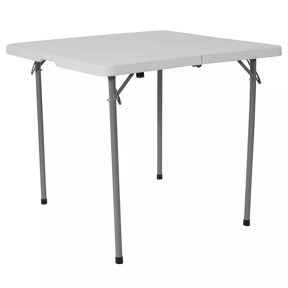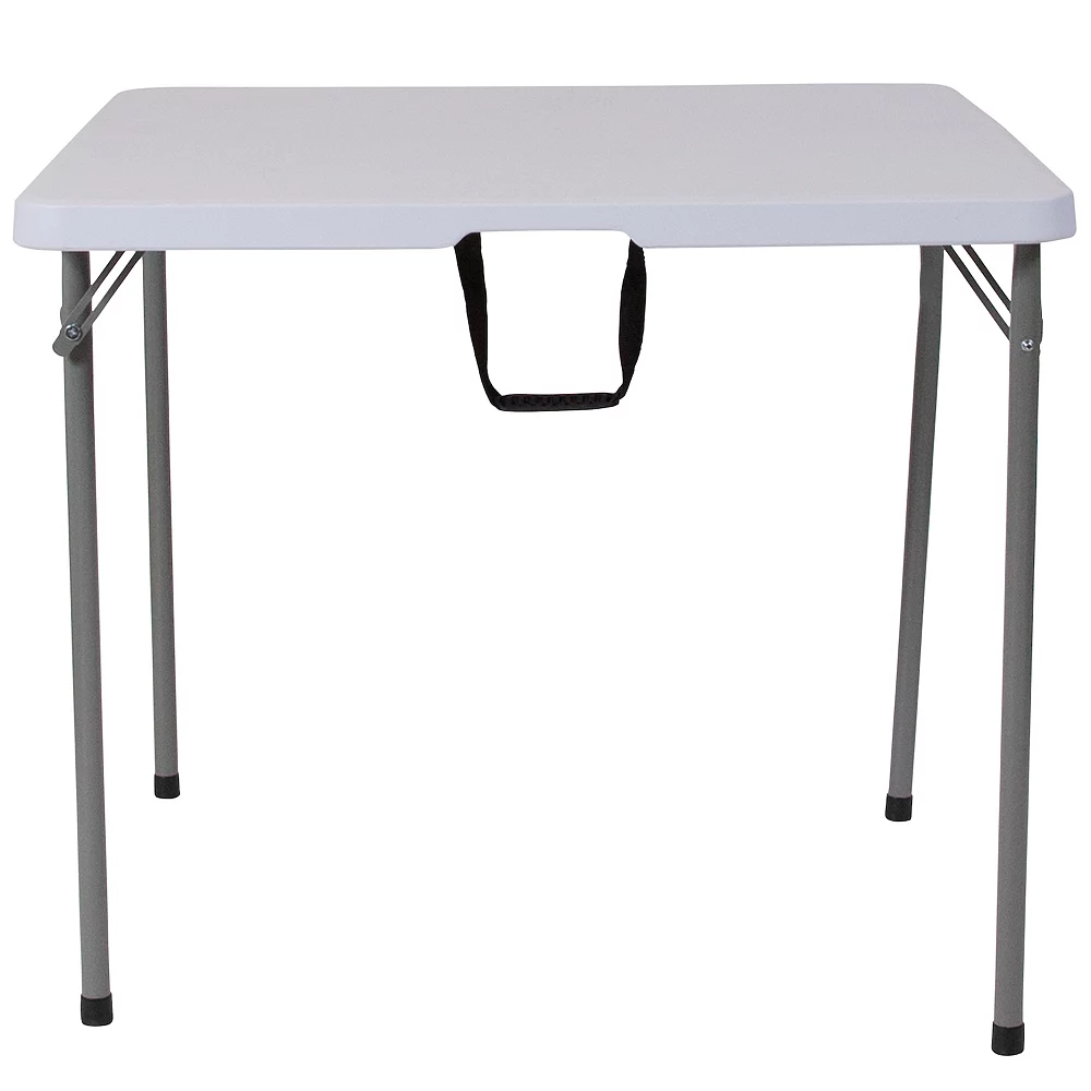 It’s game time when you pull this folding table out that folds in half and includes a carrying handle to take with you anywhere. This square plastic folding table is perfect size seating up to 4 people for charades, card and board games, making slime, or painting clay pots. This compact table can serve multiple uses in the hospitality industry, business offices and in the home to seat extra people or hold plates, napkins and cups during gatherings. Dine outdoors on the deck to enjoy the summer breeze, this table sets up in no time. This mini table travels well for people who live on the road in vans, campers and RVs. When you’re ready to put away the legs lock underneath the top to be stored away. Enjoy this portable table inside or outside but always store indoors to protect the frame from extreme moisture.