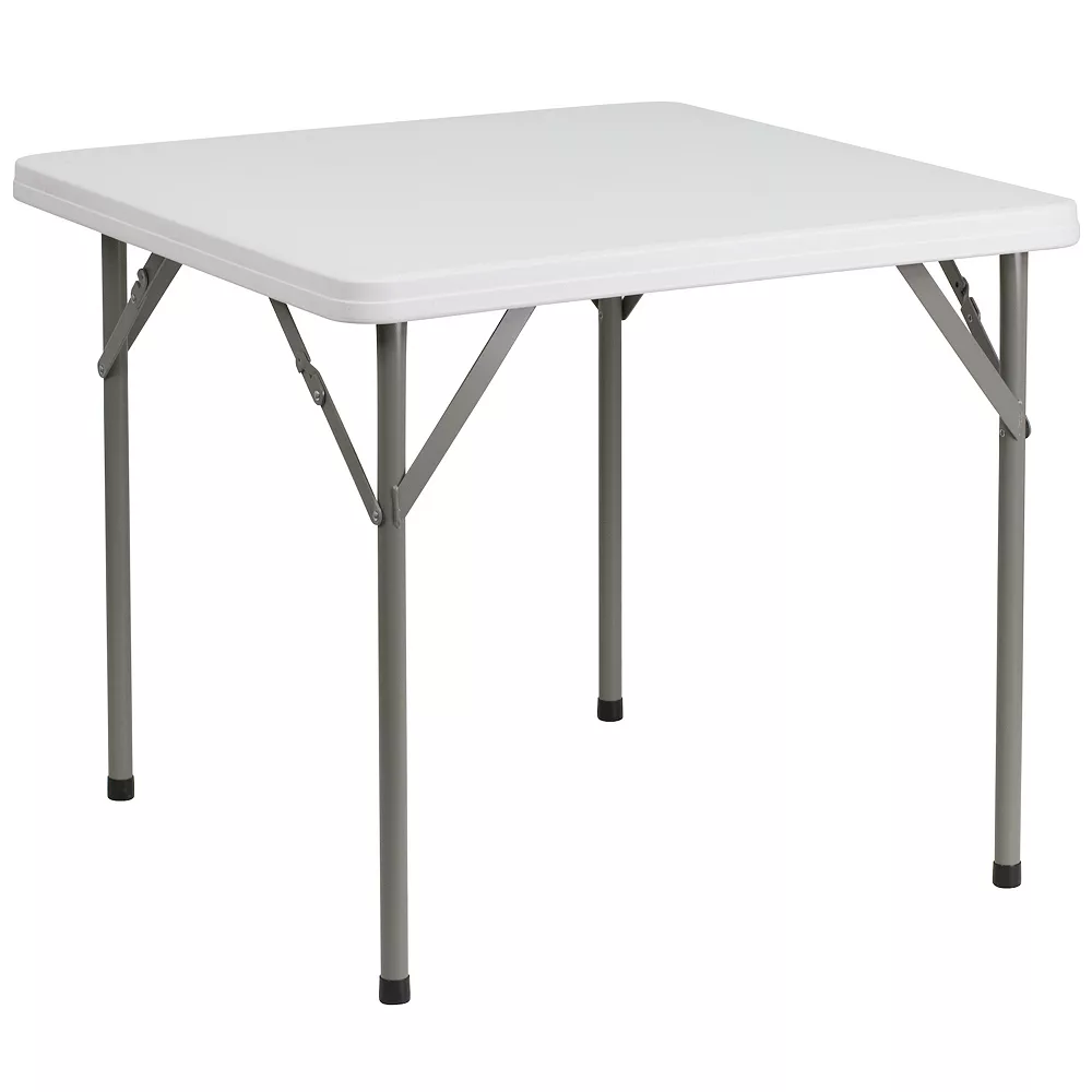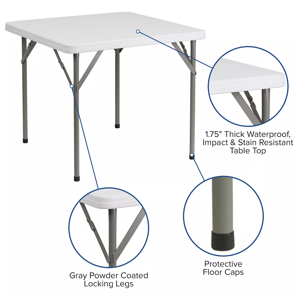 It’s game time when you pull this folding table out that folds in half and includes a carrying handle to take with you anywhere. This square plastic folding table is perfect size seating up to 4 people for charades, card and board games, making slime, or painting clay pots. This compact table can serve multiple uses in the hospitality industry, business offices and in the home to seat extra people or hold plates, napkins and cups during gatherings. Dine outdoors on the deck to enjoy the summer breeze, this table sets up in no time. This mini table travels well for people who live on the road in vans, campers and RVs. When you’re ready to put away the legs lock underneath the top to be stored away. Enjoy this portable table inside or outside but always store indoors to protect the frame from extreme moisture.