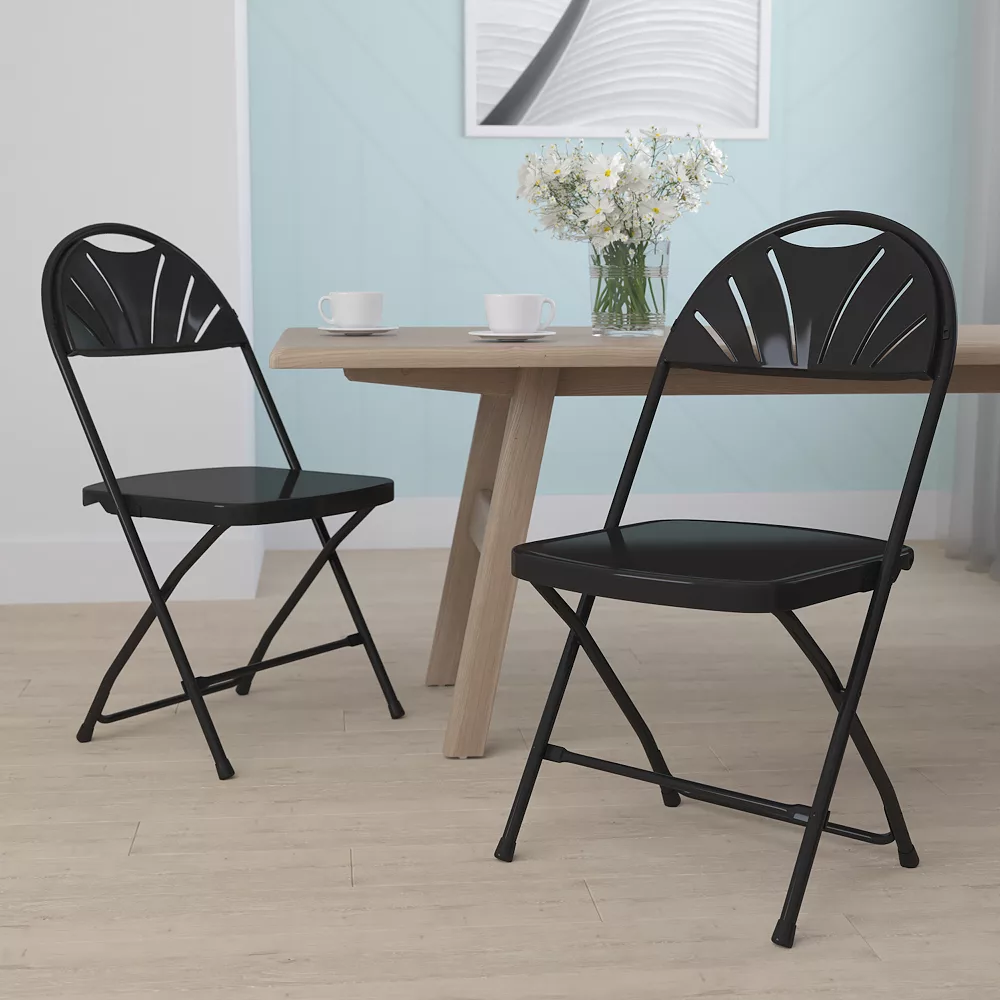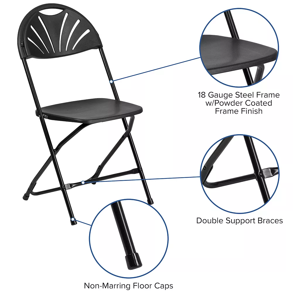 Imagine getting to setup these gorgeous fan back plastic folding chairs outside your venue where wedding ceremonies are held on sunny days as guests sit excitedly awaiting the arrival of the bride. Plastic folding chairs offer an easy seating solution for formal and informal events. Plan high tea, weddings, baby showers, and social events for clients. Folding chairs are more than ideal for the home to accommodate additional people during dinner parties, holidays, game nights, barbecues and book clubs. Their foldable design allows you to store them in your hall closet, garage or underneath furniture if you’re tight on space. With an 18-gauge steel frame built to hold up to 650 pounds you’ll have no problem seating all guests. Although designed for indoor use these foldable chairs have drain holes in the seat to prevent water from pooling during outdoor affairs and the textured seating surface is easy to clean after the most hectic events. Have your facilities manager stock plenty of these popular party chairs. After events these folding chairs stack on top of each other for compact storage, pair with a dolly to transfer between locations or keep them stored on the dolly.