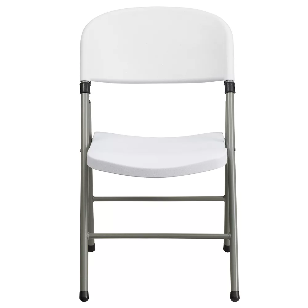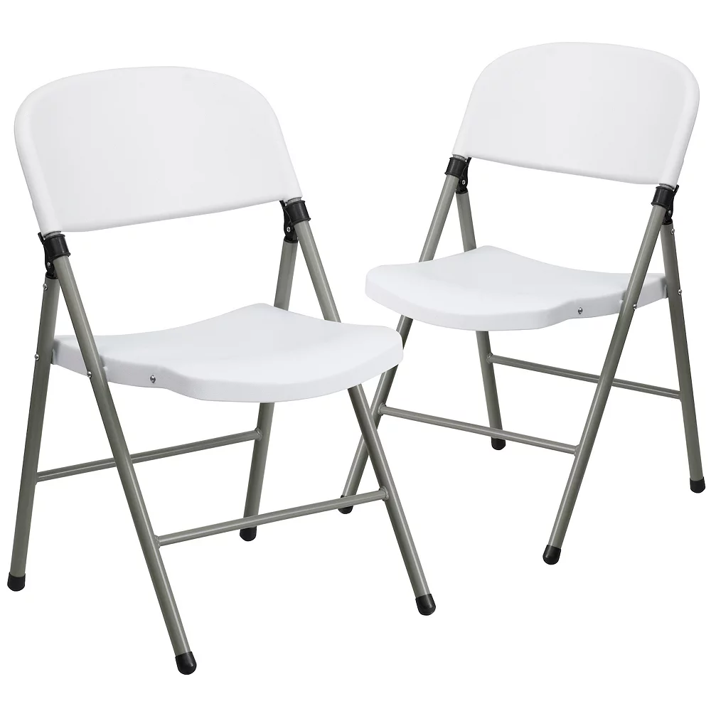 Our 2-pack of white folding chairs offers a perfect seating solution for your next event. Combining a sturdy gray frame with a white seat and back, these chairs offer a simple yet classy addition to any venue and color scheme. Whether you’re setting up a small backyard get-together, a stylish wedding or a large professional corporate function, our lightweight folding chairs help make your next event a breeze. Crafted from steel, our set of two folding chairs boasts a durable frame that can support up to 330 pounds. The body is made from sturdy plastic, with a textured seat for additional seating safety. A gentle waterfall seat edge provides extra comfort and support for your legs, making these chairs a great choice for long events. Enjoy stylish seating that’s ideal for both indoor and outdoor events with these white folding chairs. When using for outdoor events store indoors to protect the frame from extreme moisture. The plastic construction can be quickly wiped off in the event of dirt or rainfall, making them extremely easy to clean. For indoor events, the protective foot caps ensure the seat stays firmly in place and doesn’t scratch your floors. When not in use, the lightweight design makes it easy to transport and store your folding chairs. Discover an effortless seating solution for any event with these white plastic folding chairs.