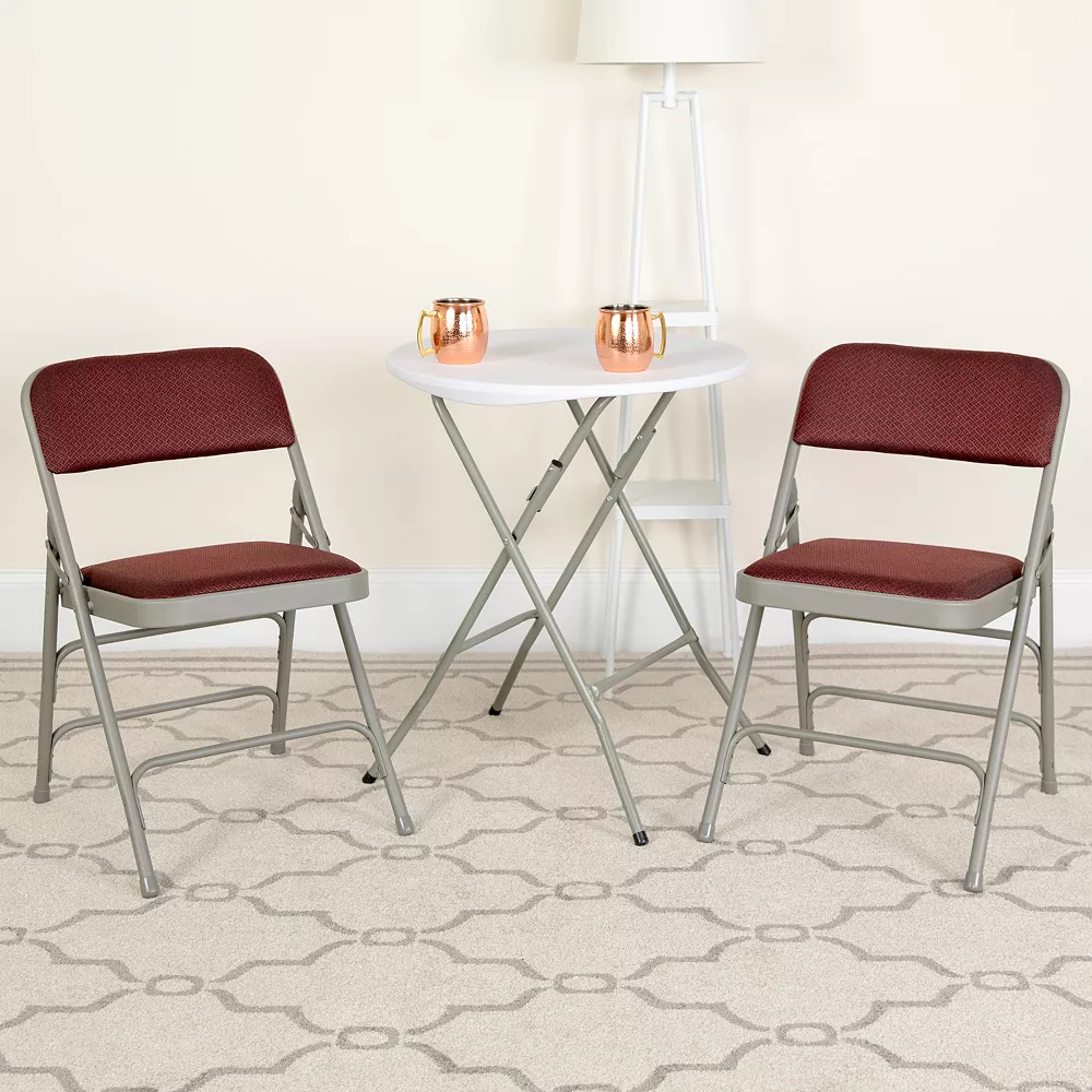 The perfect host is always prepared for that surprise guest and this classic upholstered metal folding chair is the perfect option to accommodate additional guests. These portable chairs are popular at community centers due to their durability, compact storing capability and ease of setup. Suitable for everyday use and all celebrations you can host holiday parties, birthdays, girl’s night in and game night. Host fantastic outdoor events while the weather is nice. Padded folding chairs provide comfort during extended meetings and social gatherings. Its 18-gauge curved powder coated steel frame is triple braced, and double hinged with leg strengthening support bars to hold up to 300 pounds. Non-marring floor glides on the legs protect your floors by sliding smoothly when you move them. Built for commercial use these attractive chairs are a smart seating solution for your next business meeting as well as in the home for family gatherings and other social events. After outdoor events, store indoors to protect the frames from extreme moisture. With nothing to assemble these chairs come ready to service your needs.