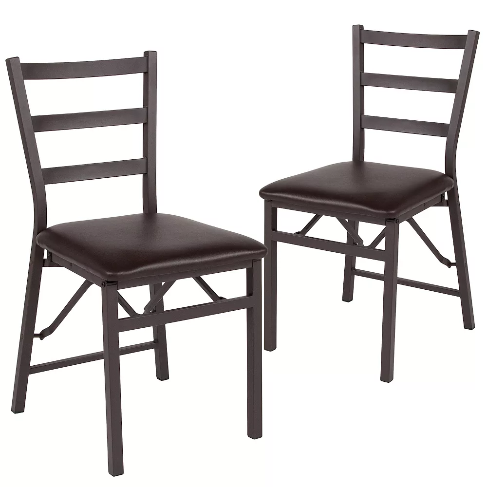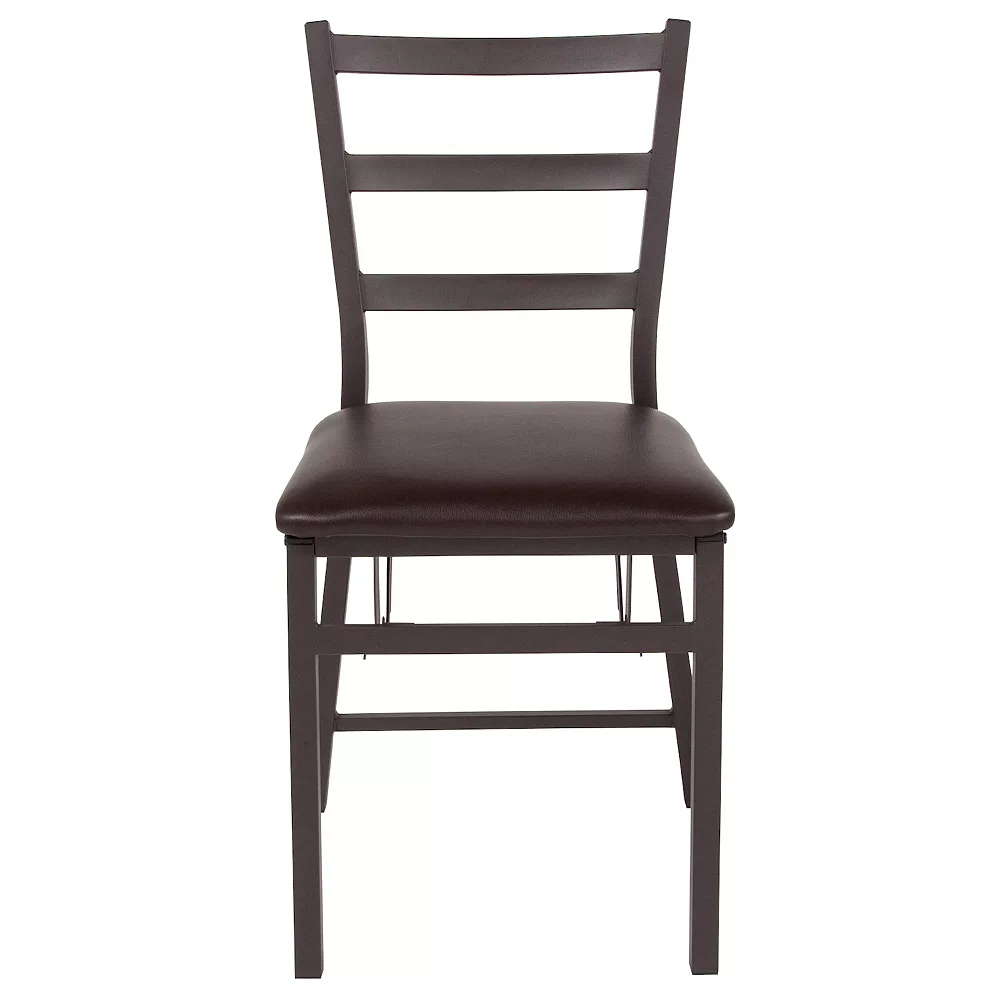 The functional, Brown Folding Ladder Back Metal Chair makes it easy to have extra seating on hand while providing aesthetically quality chairs to your dinner party. A ladder back chair is the most popular style of choice, making it a seamless fit in your home. Keep guests comfortable while entertaining with a 1 thick padded seat and your space looking neat with compact storage. When folded, the chair measures at 3 deep. The chair includes crash resistant caps to prevent scratches on the frame when the chair is closed. This upholstered folding chair can act as a temporary or permanent seating solution in your restaurant, dining room, kitchen, basement or other lounge area.