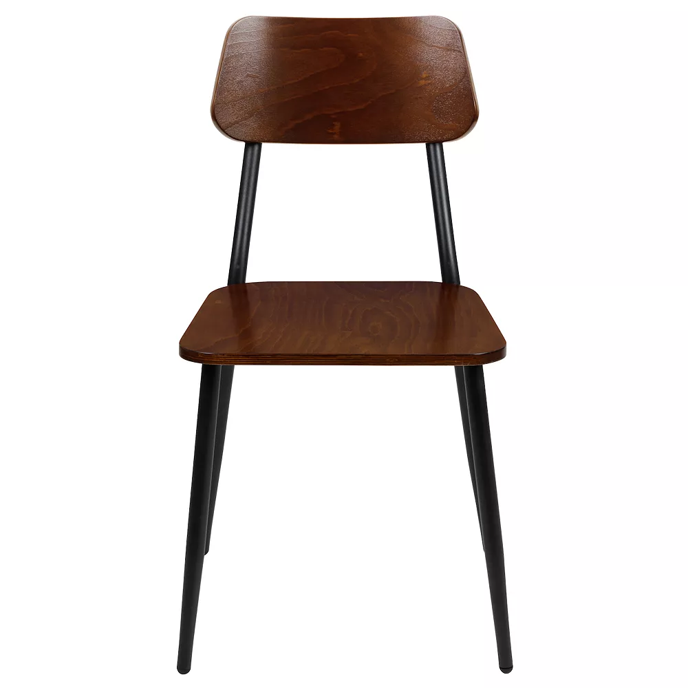 When furnishing your establishment you need seating that can change with your decor and you won’t be disappointed with this set of 2 richly hued dining chairs. The mixed media design blends seamlessly giving this dining chair an up to date appearance that will go from modern industrial to rustic farmhouse and just about everything in between. This solid restaurant dining chair boasts an easy to clean mahogany finish, which is an important aspect when it comes to a business. The gently curving back is contoured to cradle you in comfort for a more pleasant dining experience. Although designed to withstand the daily rigors in the hospitality industry, this versatile chair will also provide a warm and inviting quality to your home. Use the wasted space in any room by tucking this piece into corners as an accent chair or use as extra seating for guests in the living room, dining room or kitchen. The durable steel frame is stabilized with under seat supports for worry-free seating. This chair arrives fully assembled for quick setup and stacks up to 5 high for easy storage. Plastic floor glides help protect your floors and ensure smooth gliding. The simple style of this rustic dining chair will highlight any space in your home or business.