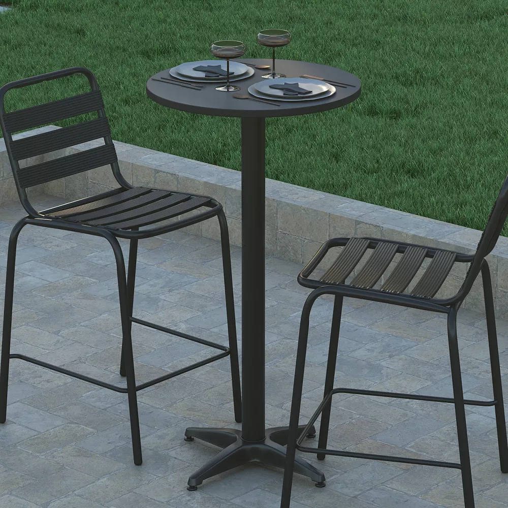 Take cocktail hour up a notch at your venue with this bar table with smooth designer looking top. Perfect for storing many, the top flips up with a touch of a button and is easy to clean. Transport with ease as this bar height dining table has a lightweight aluminum base to quickly move indoor and outdoors for your events. Create a formal setting by covering this table in a long table cover or use as is outdoors on the patio. With seating for two, you can pair with two aluminum bar chairs or have guests stand around the table with a drink while they wait to be seated. When using outdoors, care should be taken to protect from long periods of wet weather.