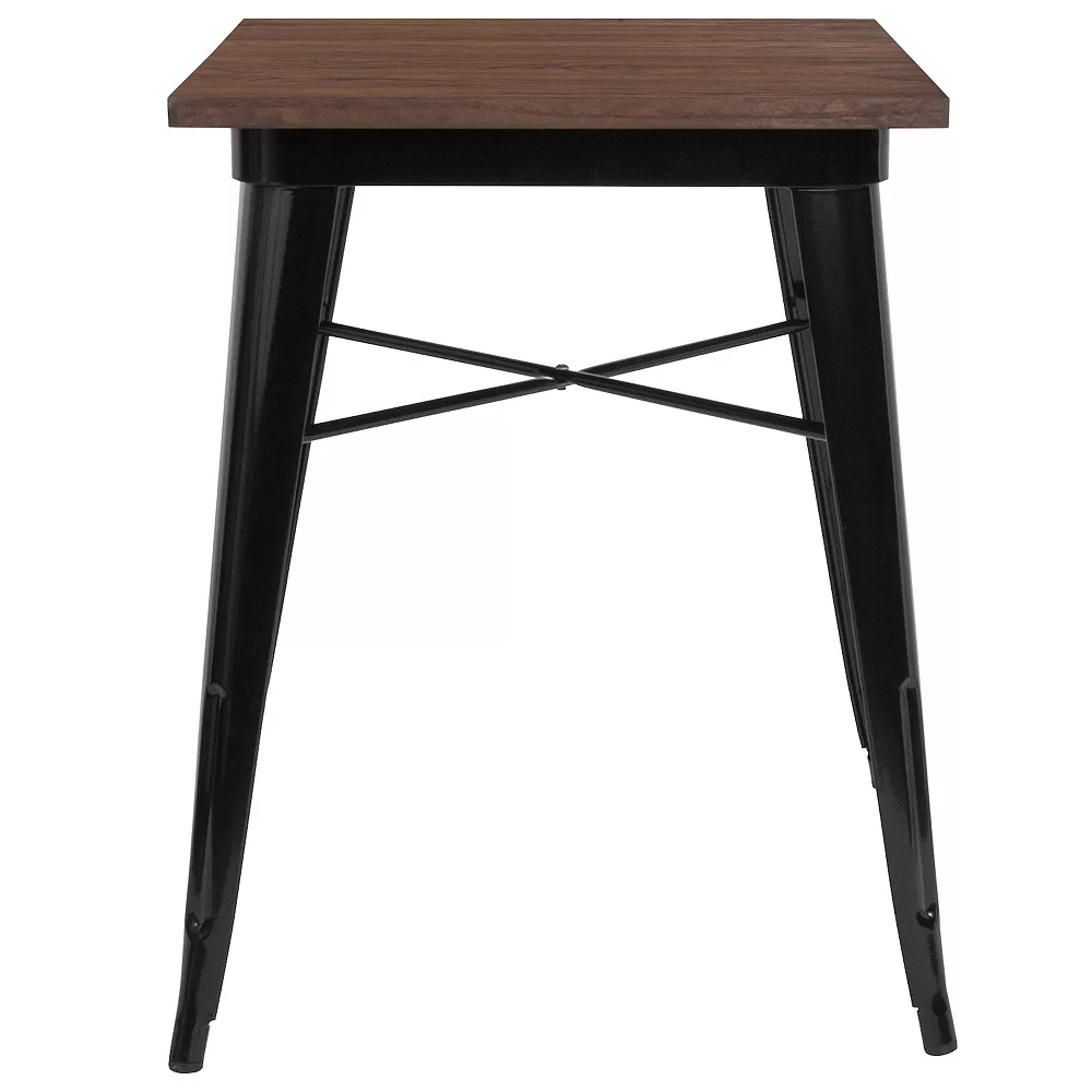 Welcome your customers in with style when you choose this square walnut standard height table with a metal frame. This sturdy table won’t take up much floor space in your busy setting and provides your patrons with a cozy space to share food, drink, and conversation. Compact in design, the square tabletop has an appealing textured top. A cross-brace under the tabletop provides increased support and stability. Rubber floor glides protect your floor by sliding smoothly when you need to move it. Designed for both commercial and residential use, this trend-setting table is a great choice for coffee shops, bistros and your kitchen.