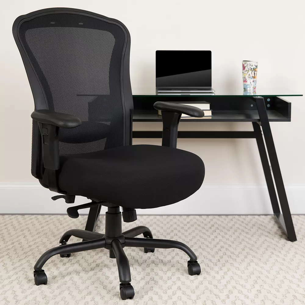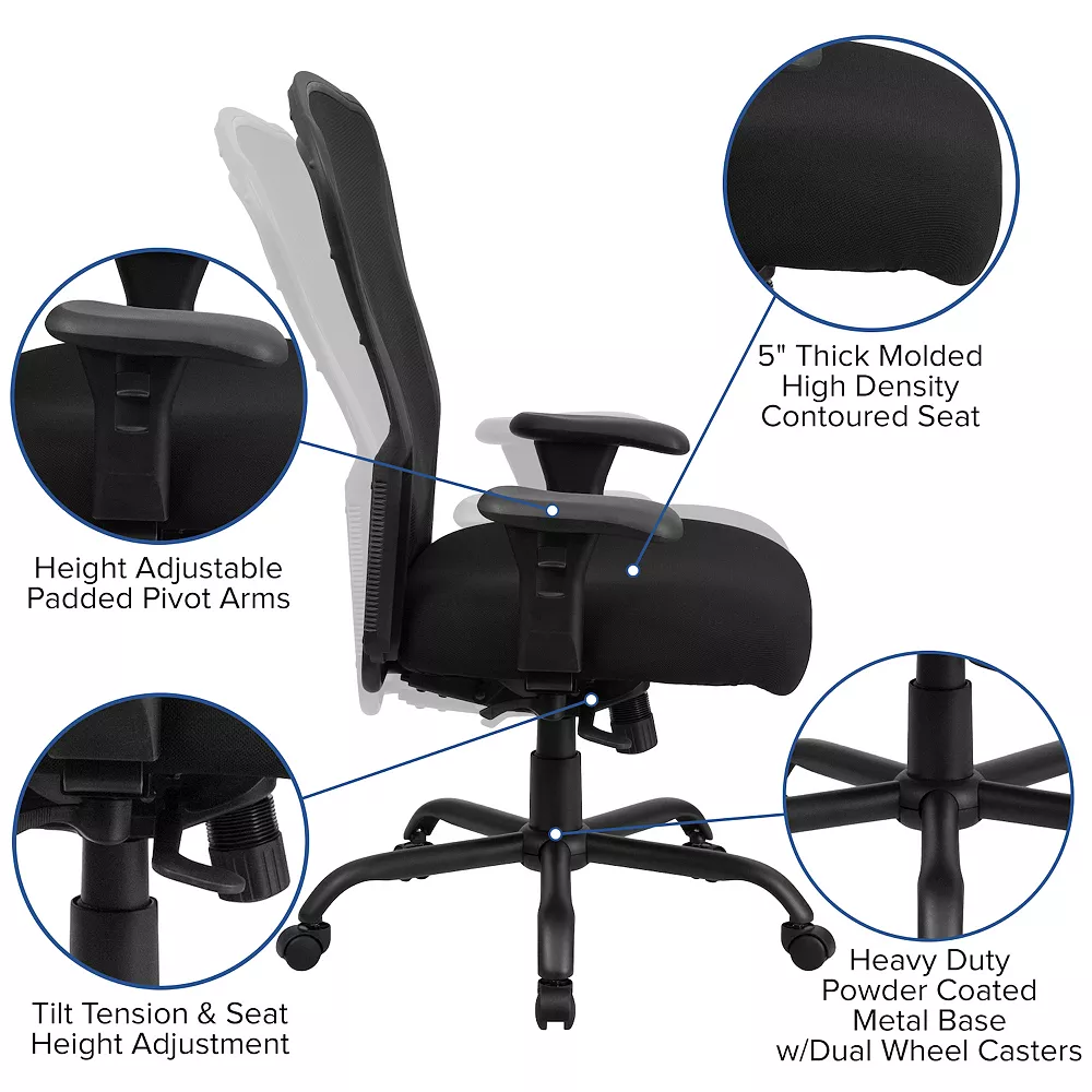This chair was designed to meet your around the clock needs. Also known as multi-shift task chairs, a 24-hour office chair is designed for extended use or multiple-shift environments. This chair can be used in a 9-5 setting, but it was specifically designed to meet the needs of workers in 911 dispatch offices, nurses’ stations, call centers, control room engineers, disc jockeys, and government personnel. The big and tall design also aids in accommodating larger and taller body types. This chair has been tested to hold a capacity of up to 400 lbs., offering a broader seat and back width. The high back extends to the upper back for greater lumbar support. Mesh office chairs can keep you more productive throughout your work day with its comfort and ventilated design. The synchro tilt control allows the chair’s back and seat to recline at different rates, increasing the angle between your torso and thighs. The contoured seat dissipates pressure points for greater comfort. The waterfall front seat edge removes pressure from the lower legs and improves circulation. Chair easily swivels 360 degrees to get the maximum use of your workspace without strain. The pneumatic adjustment lever will allow you to easily adjust the seat to your desired height. The adjustable armrests take the pressure off the shoulders and the neck, which minimizes the risk of pain. The heavy duty metal base is constructed to keep up with the demands of an intensive use chair.