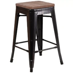 Save on space with this Backless Metal Bar Stool with wood seat. The clean lines and simple design of this square, industrial style stool will look great in your kitchen or inside your bar/restaurant. Designed to stack, this stool is an ideal choice in the restaurant industry. A cross brace underneath the seat adds extra stability and features plastic caps that prevent the finish from scratching when stacked. The lower support brace doubles as a footrest, and floor glides protect your floor by sliding smoothly when moving it. Designed for both commercial and residential use, this bar height stool will provide refreshing rustic feel with its metal and wood features.