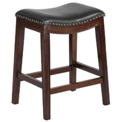 If you want your design to say timeless when you’re dressing your entertainment space then this backless cappuccino wood finish counter height stool will make a beautiful statement. Classically designed and very easy on the eye, this stool, boasting soft and durable black LeatherSoft upholstery, will lend your kitchen, dining room, bar or game room an upscale sophistication. Stool features a curved saddle seat design, decorative nail trimming on the seat and gracefully bowed out legs with footrest. Spills clean up easily with a solvent and water-based cleaner such as foam while the floor glides help protect your floors and ensure smooth gliding. This stool offers sublime comfort along with class.