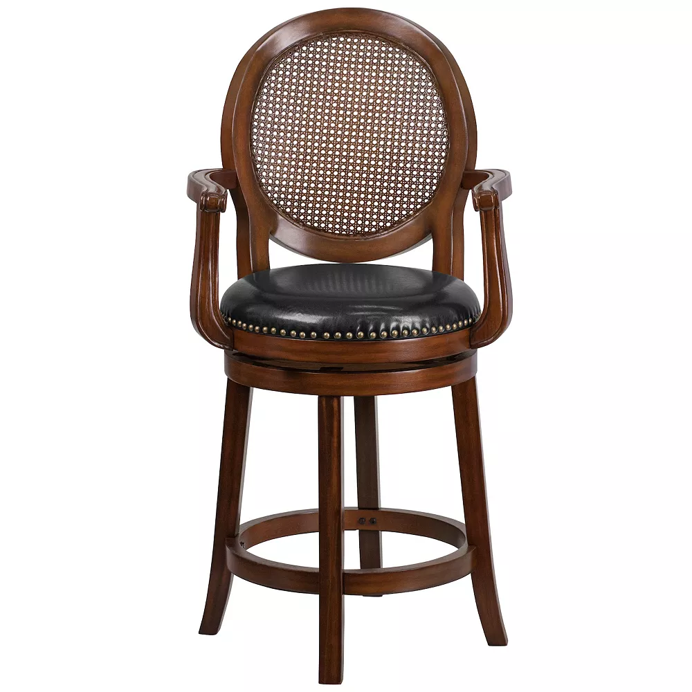 If you want your design to say timeless when you’re dressing your entertainment space then this espresso wood finish counter height stool with arms will make a beautiful statement. Classically designed and very easy on the eye, this stool, boasting soft and durable black LeatherSoft upholstery, will lend your kitchen, dining room, bar or game room an upscale sophistication. Stool features an oval woven rattan back, decorative nail trimming on the seat and gracefully flared legs. The 360 degree swivel seat allows you to swing around effortlessly while the durable wood frame is stabilized with the included foot ring. Spills clean up easily with a solvent and water-based cleaner such as foam while the floor glides help protect your floors and ensure smooth gliding. This stool offers sublime comfort along with class.