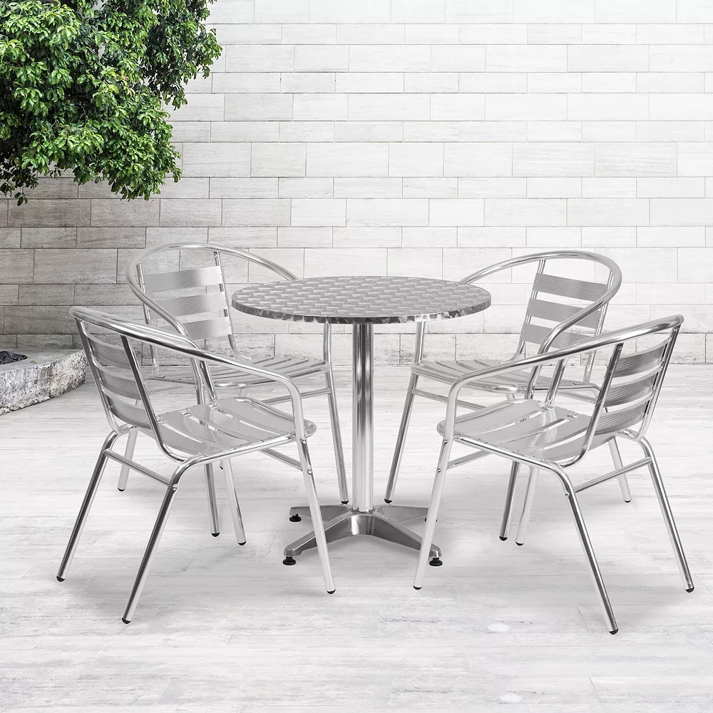 Create an enjoyable dining experience with this table set that will enhance your bistro, cafe, restaurant, hotel or home patio space. The designer style stainless steel table top features a smooth surface for keeping items level. The column and base are constructed of lightweight aluminum material. The chair is lightweight and easy to move and store. For easy storing and cleaning purposes these chairs stack up to 20 chairs high. This set was designed for all-weather use making it a great option for indoor and outdoor settings. For longevity, care should be taken to protect from long periods of wet weather. Whether you are just starting your business or upgrading your furniture this set will complete the look.