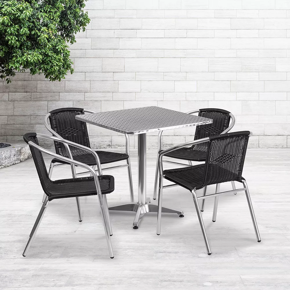 Create an enjoyable dining experience with this table set that will enhance your bistro, cafe, restaurant, hotel or home patio space. The designer style stainless steel table top features a smooth surface for keeping items level. The column and base are constructed of lightweight aluminum material. The chair is lightweight and easy to move and store. For easy storing and cleaning purposes these chairs stack up to 20 chairs high. This set was designed for all-weather use making it a great option for indoor and outdoor settings. For longevity, care should be taken to protect from long periods of wet weather. Whether you are just starting your business or upgrading your furniture this set will complete the look.