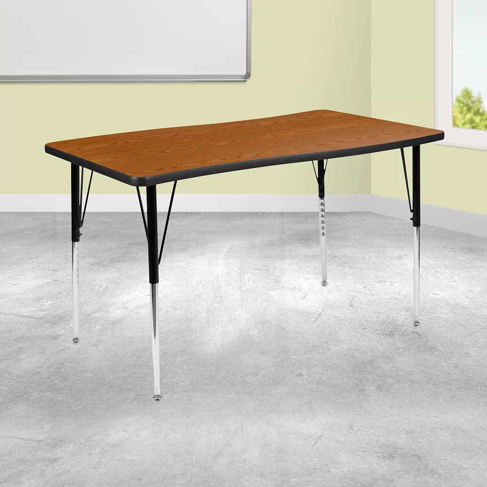 Bring group projects to the table on this collaborative wave activity table that’s designed to nest two or more wave activity tables together, but cool enough to use as a standalone classroom table. Wave classroom tables instantly modernizes your classroom to bring excitement to the learning environment. Students feel more encouraged to work in groups with furnishings designed for collaboration. Built to last through many class turnovers the thermal fused laminate top is scratch, stain and warp resistant. An attractive black powder coated finish protects the upper legs from scratches and height adjustable chrome lower legs give you the flexibility to raise or lower the table a full 9 in 1 increments. Self-leveling nylon floor glides keep the table from wobbling and protect your floor by sliding smoothly when you need to move it. Mix various shaped nesting activity tables around the classroom for better interaction between students as well as helping to define workspaces. This table accommodates four 16 or 18 seat ergonomic shell stack chairs. For the ultimate classroom setup add our soft seating collaborative circle and moon shaped ottomans to add color and safety. Collaboration doesn’t happen only in the classroom, add this office group table in your conference room or collaborative space for team members to gather around.