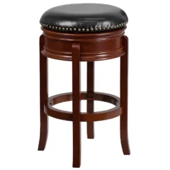 Set a welcoming tone at your kitchen island or bar with this swivel bar height stool featuring soft and durable black LeatherSoft upholstery. These traditional stools will look gorgeous around your pool table to give everyone a good view while playing or waiting to take on the winner. This swivel stool is crafted from a durable wooden frame with a cappuccino finish and has floor glides that’ll protect your hard surfaced flooring. Clean up spills with a solvent and water-based cleaner such as foam to keep this stool looking great. Backless stools allow full access seating from every angle and provide a clean line of vision when pushed underneath kitchen island overhangs. The circular footrest stabilizes the stool and supports your feet for comfort. Attractively styled with nailhead trimming and bowed legs, this dining stool can help warm up the ambiance in your home.