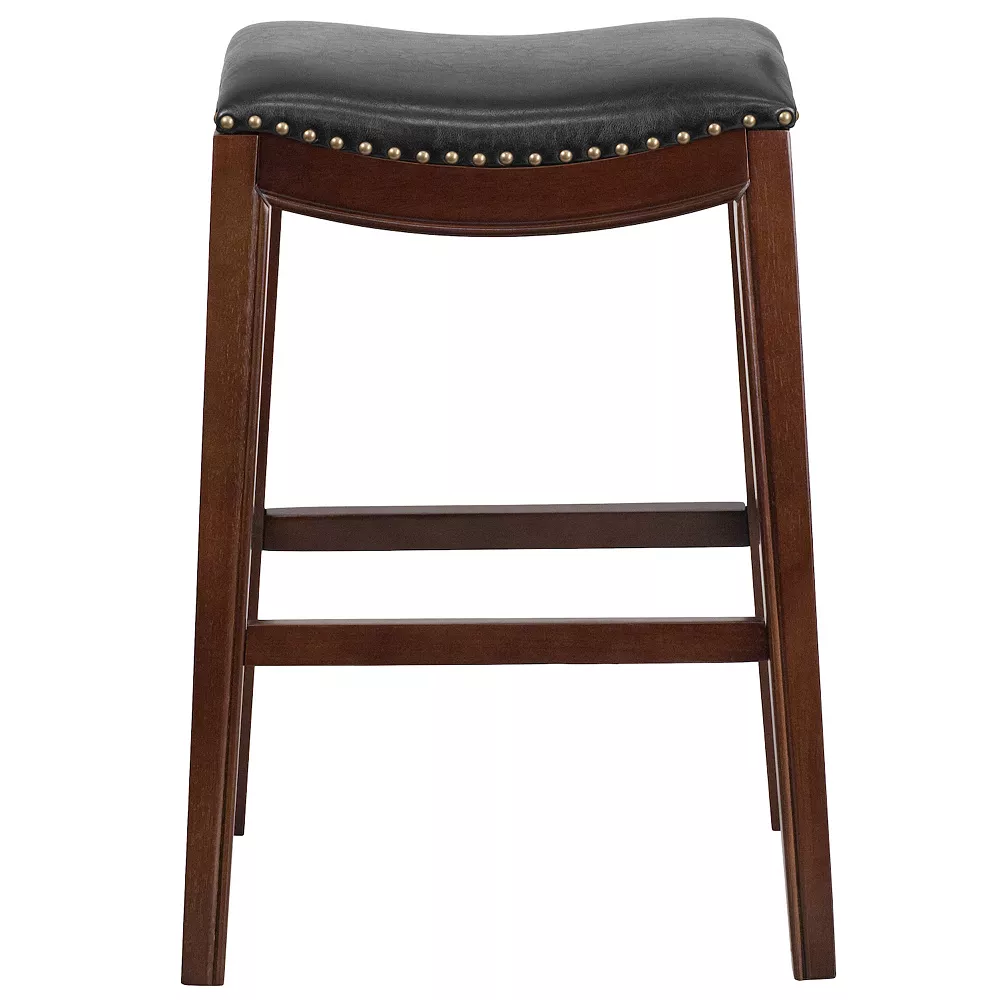If you want your design to say timeless when you’re dressing your entertainment space then this backless cappuccino wood finish barstool will make a beautiful statement. Classically designed and very easy on the eye, this stool, boasting soft and durable black LeatherSoft upholstery, will lend your kitchen, dining room, bar or game room an upscale sophistication. Stool features a curved saddle seat design, decorative nail trimming on the seat and gracefully bowed out legs with footrest. Spills clean up easily with a solvent and water-based cleaner such as foam while the floor glides help protect your floors and ensure smooth gliding. This stool offers sublime comfort along with class.