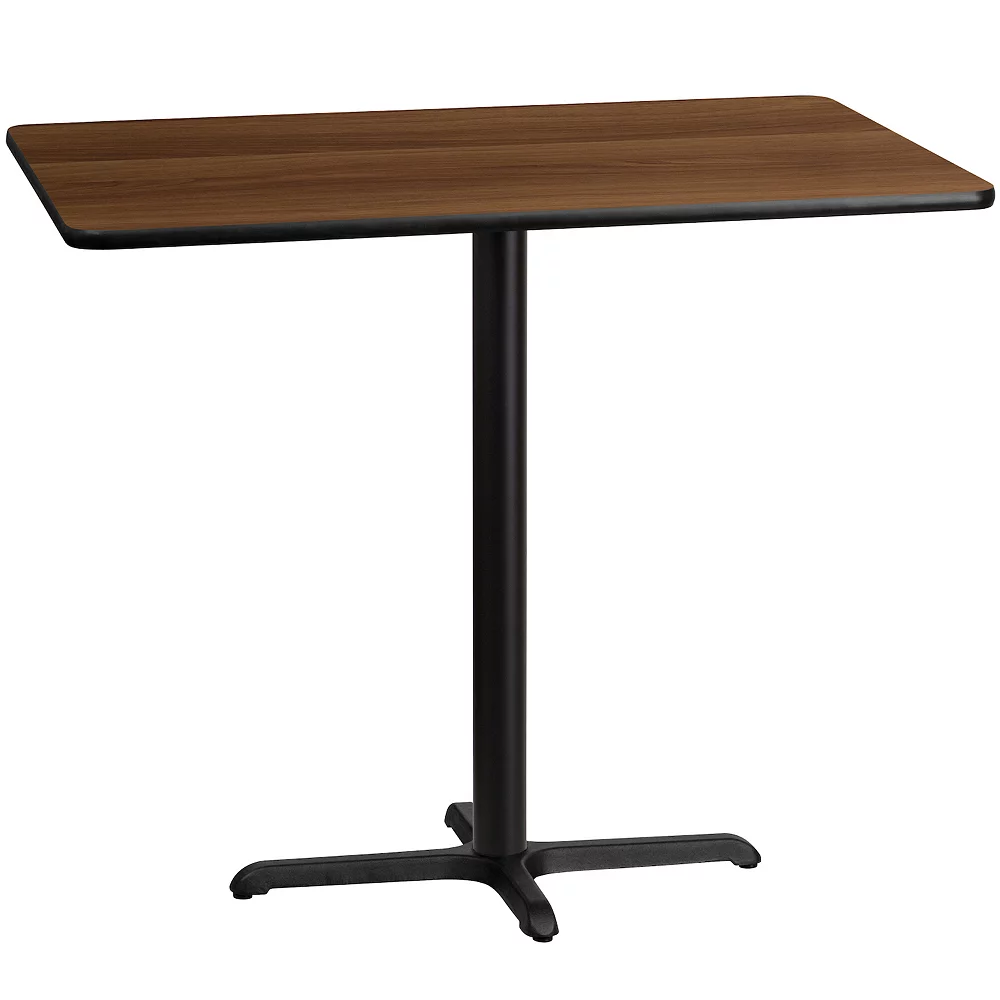 Complete your restaurant, break room or cafeteria with this bar height table top and base configuration. This set is designed for commercial use to withstand the daily rigors in the hospitality industry. This set will also make a great option for your home as a dining table or in the rec room. The reversible natural or walnut top allows you to choose your color of choice and then affix to the base. Surface is heat, scratch and moisture resistant. Use a mild detergent and water, dry clean to keep your tables spotless. Whether you are just starting your business or upgrading your furniture this bar table set will complete the look.