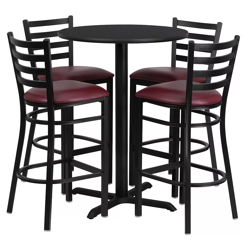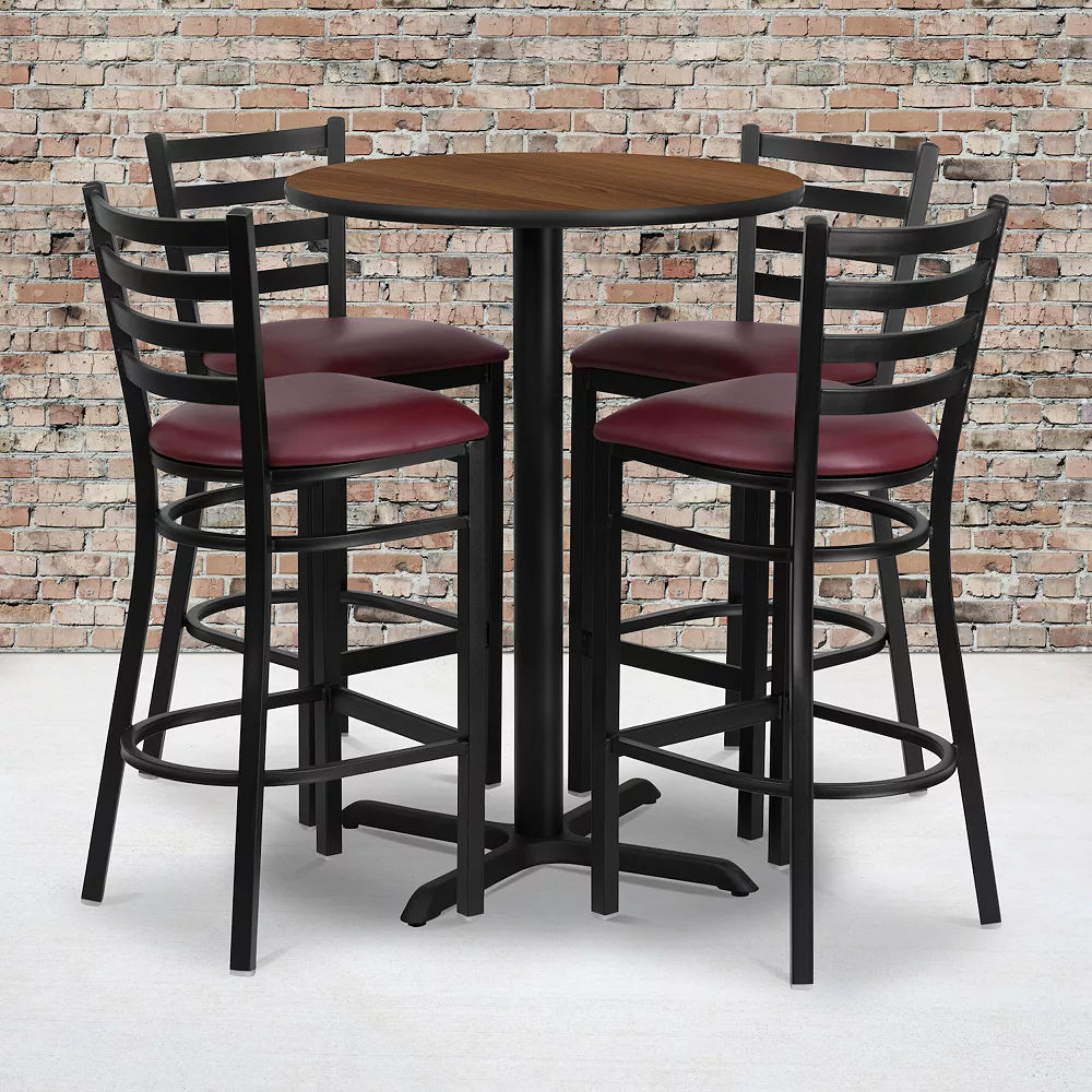 Don’t have time to search through hundreds or thousands of table and seating options? This complete Bar Height Table and Stool set saves you time to focus on your growing business. This set includes an elegant Walnut Laminate Table Top, X-Base and 4 Metal Ladder Back Barstools. Surface is heat, scratch and moisture resistant. Easily clean using a mild detergent and water, then wipe dry to keep your tables spotless. Use this setup in sports bars, banquet halls, restaurants, break room/cafeteria settings or in your breakfast nook or home bar. Mix in bar height tables with standard height tables for a more varied seating selection. Plastic floor glides prevent damage to your flooring. Whether you are just starting your business or upgrading your home or business furniture this restaurant quality bar table set will round out your dining space.