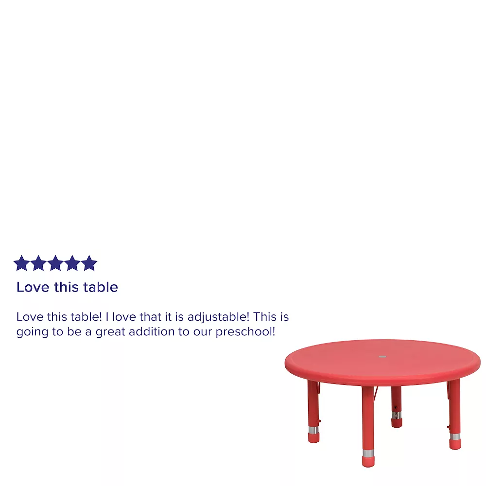 Interaction with other kids is essential for developing tots and a round activity table allows for this interaction to happen effortlessly. Perfect as a classroom table, the safety rounded edges reduce injury around rambunctious toddlers. The neutral tone focuses children on learning assignments. Adjustable height legs give you the flexibility to raise or lower to accommodate kids up to the age of 7. Children appreciate having their own area within the common areas of the home. This activity table serves as a play table or kids dining table. Host birthday parties and play dates while accommodating 4 children around this round plastic table. Don’t let spills ruin the fun, the low maintenance top is easy to clean. Boasting a neutral finish this play table is suitable for girls and boys. This plastic table is heavy-duty for use in preschools, daycares and playrooms. Pair with our natural plastic stackable school chairs for a complete table and chair ensemble.