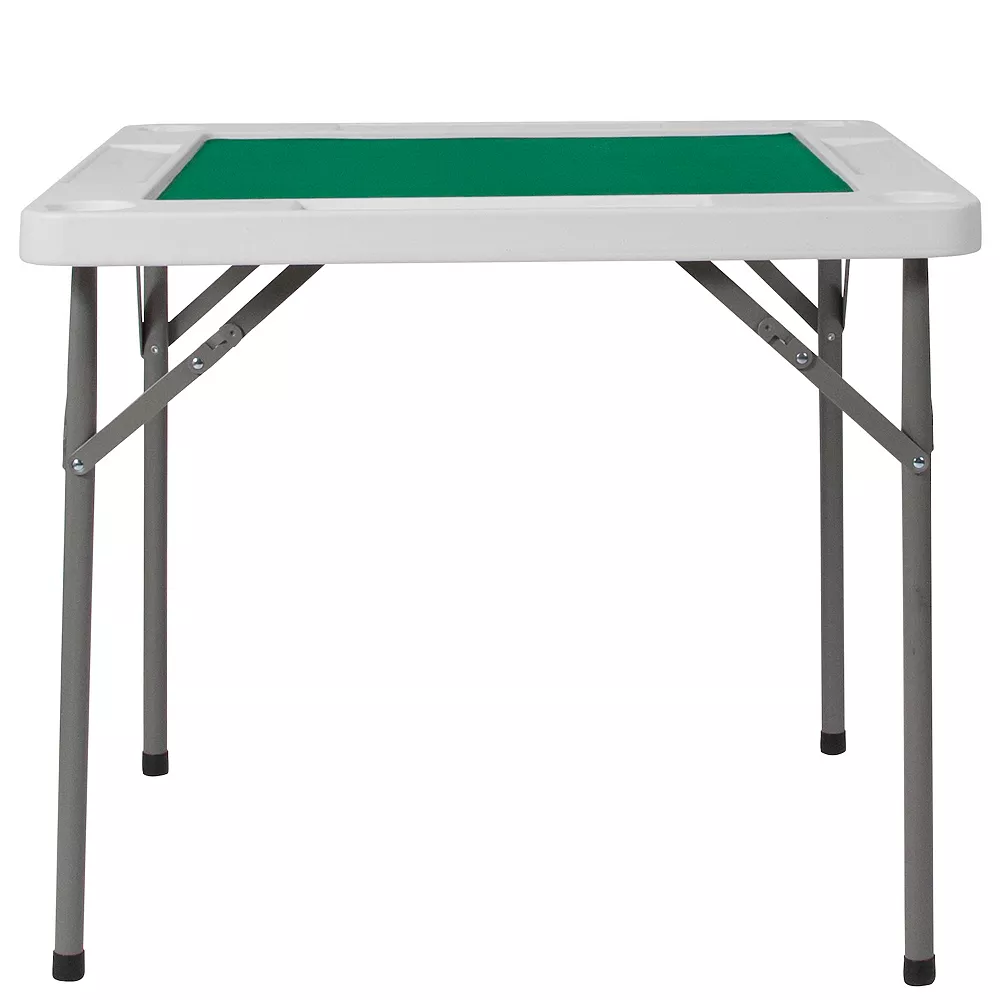 Up the ante with this folding card table that easily seats 4 people! When you pull this table out your friends will know that it is time to play for real. This table is highlighted with a felt green surface, cup holders and a placeholder for your cards with a lip. The durable plastic border will withstand years of use and clean easily. The table legs fold under the table to make storage more convenient and for better portability.