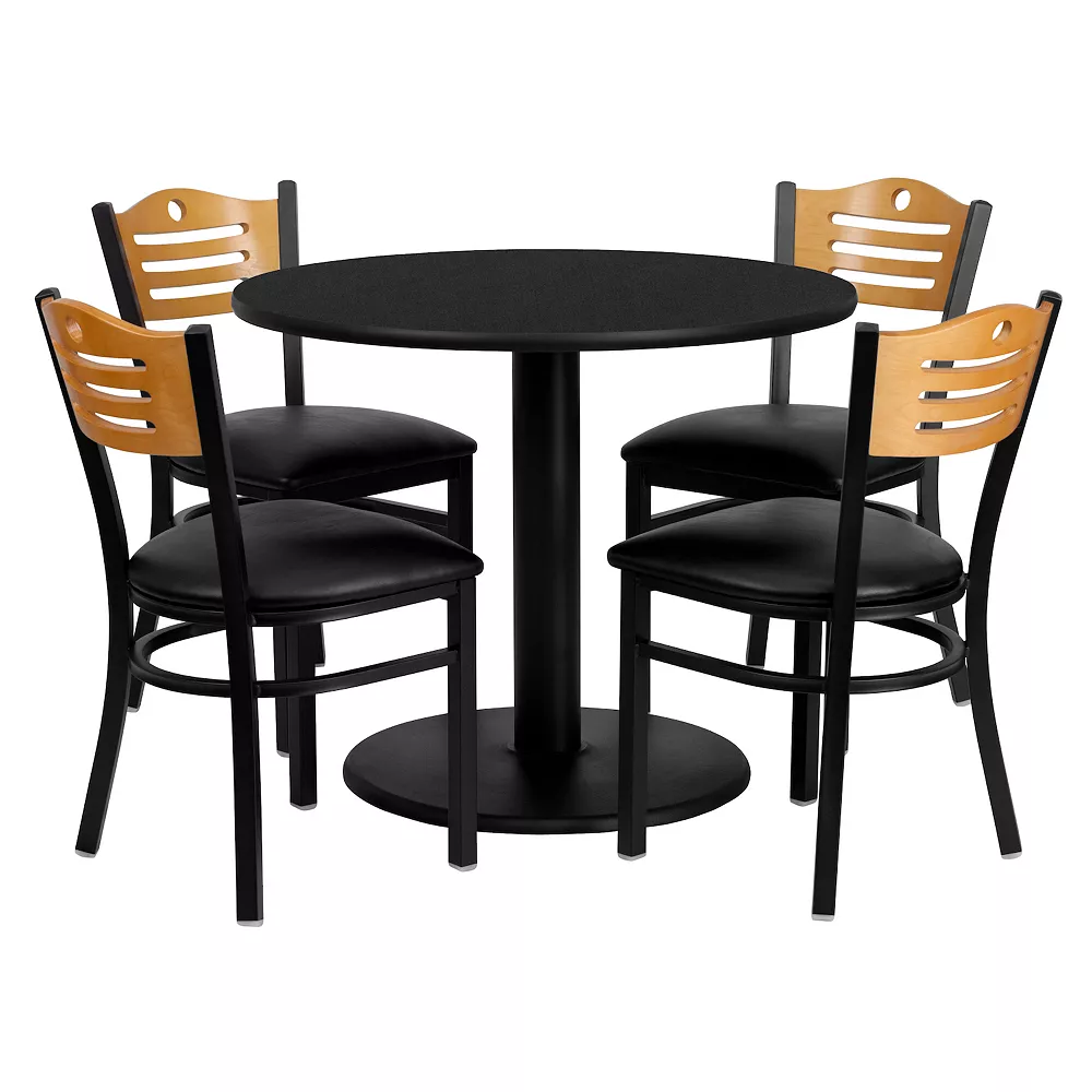 Don’t have time to search through hundreds or thousands of table and seating options? This complete Banquet Table and Chair set saves you time to focus on your growing business. This set includes an elegant Black Laminate Table Top, Round Base and 4 Metal Slat Back Chairs. Surface is heat, scratch and moisture resistant. Easily clean using a mild detergent and water, dry clean to keep your tables spotless. Use this setup in banquet halls, wedding ceremonies, hotel conferences, restaurants, break room/cafeteria settings or any other social gathering. The lightweight designer metal chair will enhance any environment. Whether you are just starting your business or upgrading your home or business furniture this restaurant quality table set will round out your dining space.