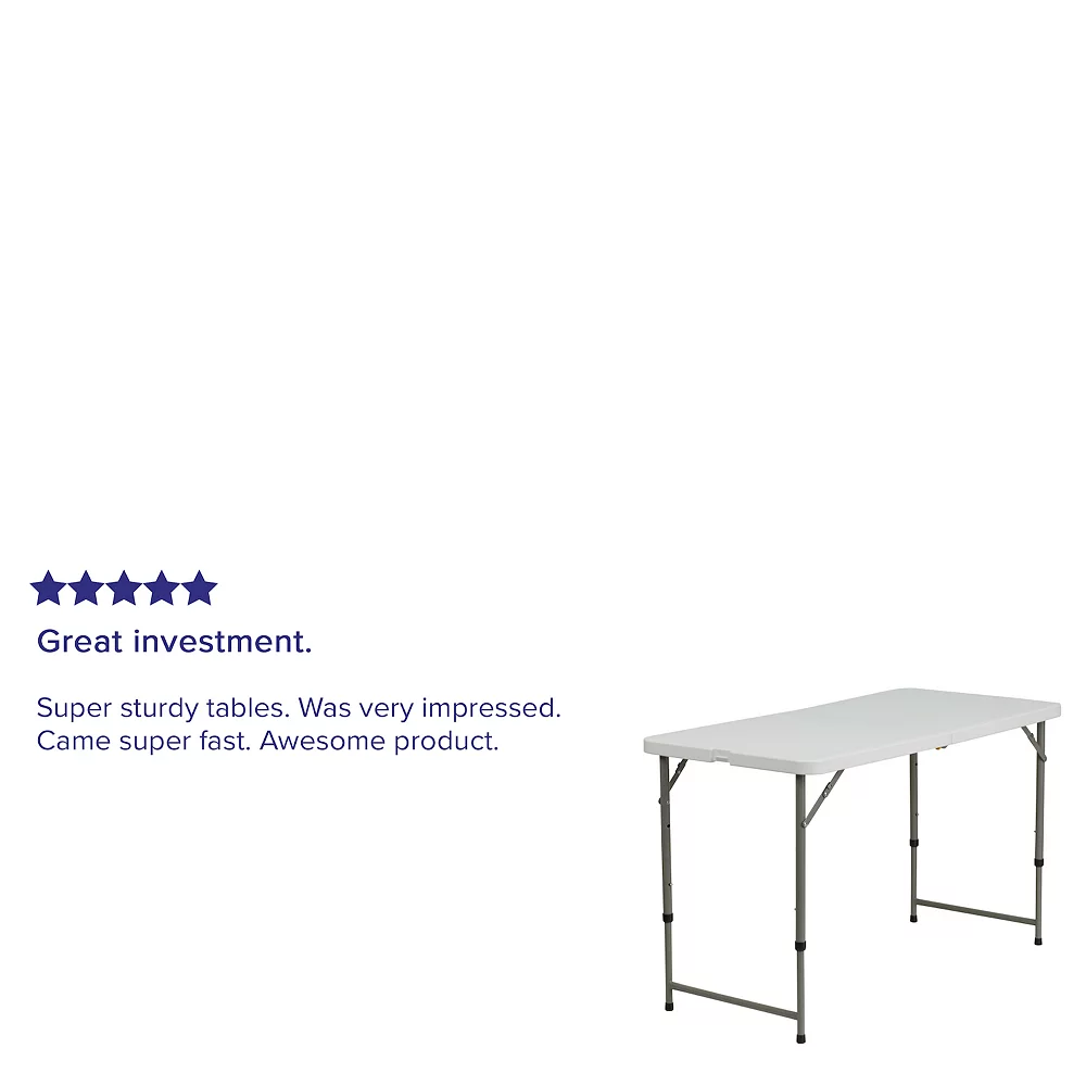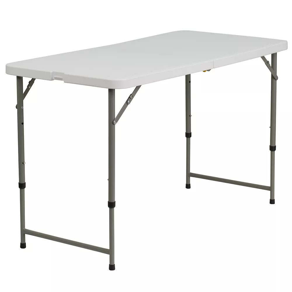 Ensure you have enough surface space for any function and take the stress out of hosting your next gathering. This rectangular bi-fold folding adjustable height table is 4 feet long and is beneficial in a multitude of settings that include banquet halls, conference centers, cafeterias, schools and in the home. Use as a temporary seating solution or setup for everyday use. This plastic folding table comfortably seats up to four adults while ensuring plenty of legroom. Speed up the time it takes to set-up and tear-down wedding receptions, graduation parties, banquets, buffets and other events with this folding table. Whether you’re hosting an indoor or outdoor gathering, the smooth design is easy to wipe clean. When using for outdoor events store indoors to protect the frame from extreme moisture. The table legs fold under for storage and provide better portability. This table is commercial grade to withstand everyday use in the hospitality industry.