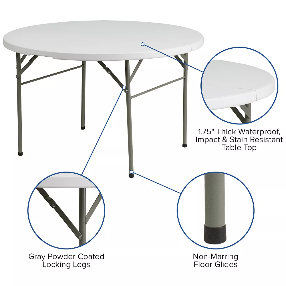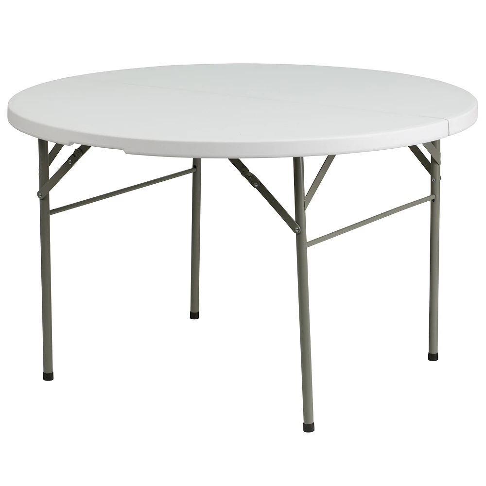 Say hello to the perfect solution for your seating crisis! This bi-fold round dining folding table is a great option for special event planners, catering companies and banquet facilities. This durable, easy to clean table is rated for commercial use in banquet halls, convention centers and at trade shows. Use during game night, dress it up for holiday parties, and coordinate crafts night. The granite white tabletop is 4′ in diameter, 1.75 thick, and will comfortably seat up to 4 adults. Its waterproof, impact and stain resistant top have a 440 pound static load capacity. Attractive gray powder coated legs lock securely in place while in use and non-marring floor caps protect your floor by sliding smoothly when you need to move the table. The table folds in half, making it easy to store and transport, using the convenient carrying handle attached on the side. When using for outdoor events store indoors to protect the frame from extreme moisture.
