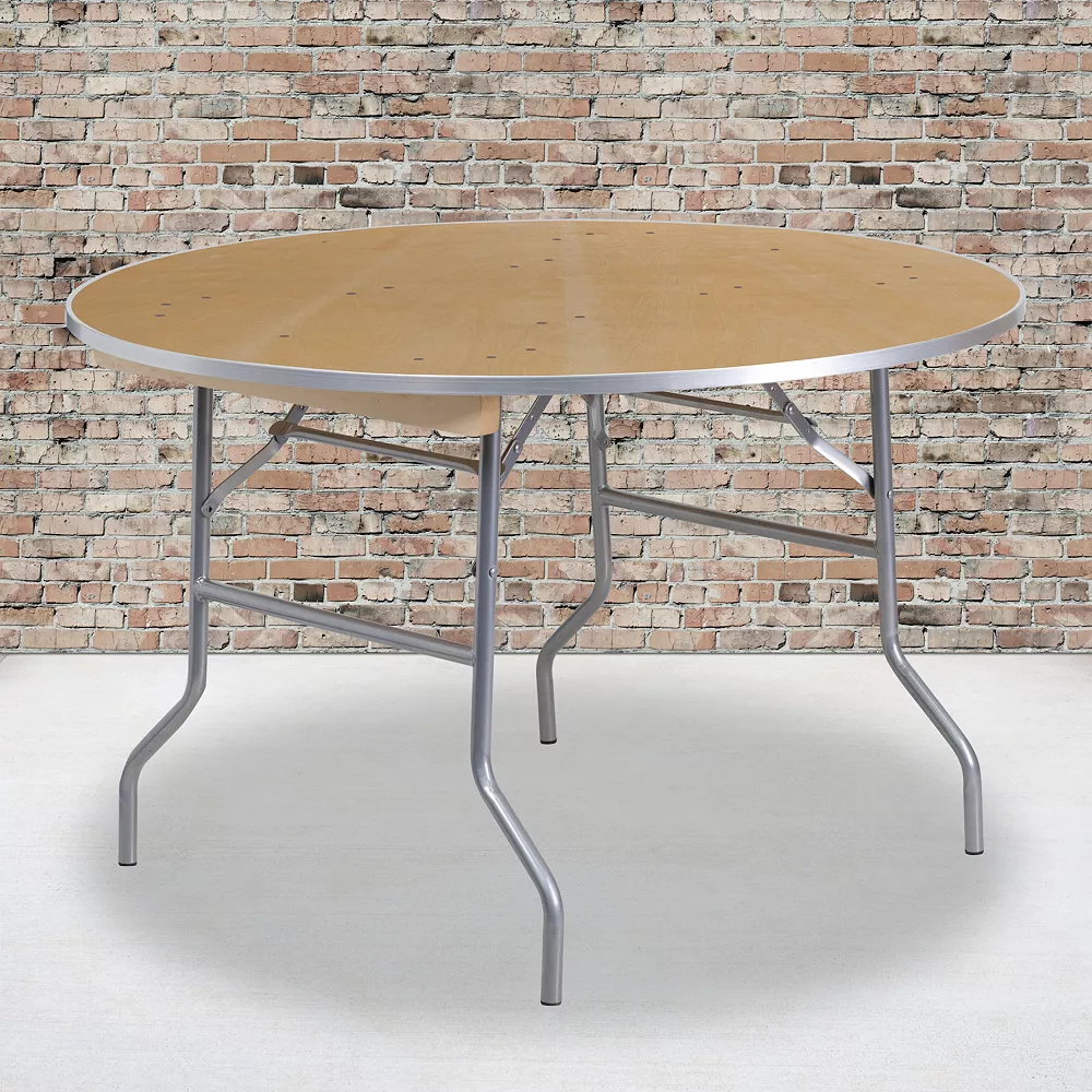 If you want a table that is sturdy, long-lasting and great at a party this heavy duty folding table is as good as it gets! This 48 Round Folding Table has a .75 thick plywood top and features an extremely durable Birchwood, hardwood surface with thick aluminum metal edging. This folding table is certain to withstand the test of time. Two extra-wide bolted wood runners are fastened to the underside and designed to allow for safe table stacking. The runners are secured to the table tops with flush fitting, flat head bolts and locking nuts. The heavy duty locking wishbone legs are constructed of 1, 15 gauge tubular steel and commercial grade powder coating. This is a particularly good choice for party rental companies and other organizations that hold many events throughout the year.
