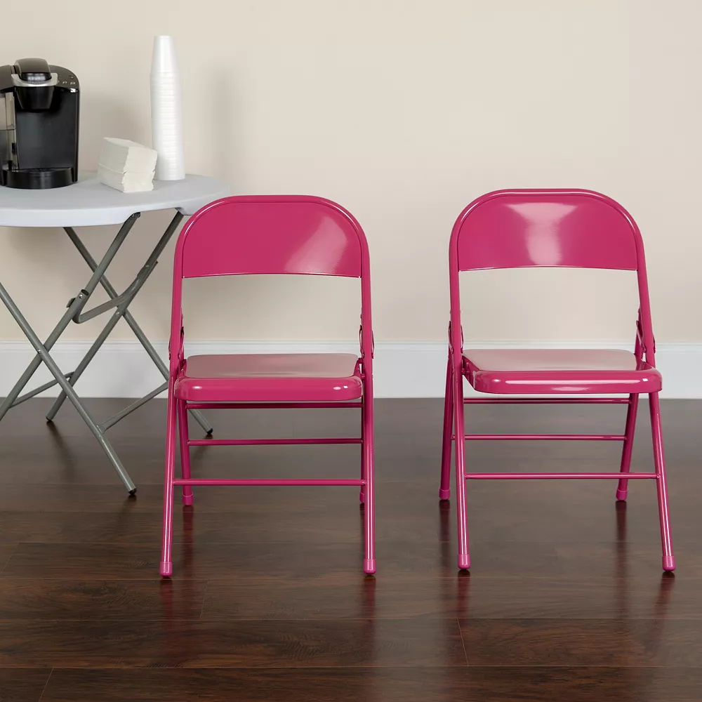 Commercial-grade metal folding chairs are designed to be lightweight but durable. This product is engineered and built with premium materials and boasts riveted steel components that will withstand heavy duty use for event, business, and home usage. These metal folding chairs feature premium 18 gauge curved steel frames and double-hinged frames for worry-free seating. With a variety of vibrant color options, you can choose what would best pair with your event needs. This is a commercial-grade on-demand seating solution convenient for weddings, school functions, barbecues, game nights, and catering events. Folding chair highlights: – Ready-to-use with no assembly required – Triple braced legs with integrated footrest – Suitable for indoor-outdoor use; Store indoors to protect frame from excessive moisture. – Floor caps to prevent surface and flooring damage – 300 lb. weight capacity- These low-maintenance party event chairs wipe down easily after luncheons and fold easily for storage, transport, or floor maintenance. Make a smart investment by purchasing multiple folding chairs for your rental business, waiting room, or corporate training rooms. Purchase our folding chair dolly for quick and easy setup and takedown.