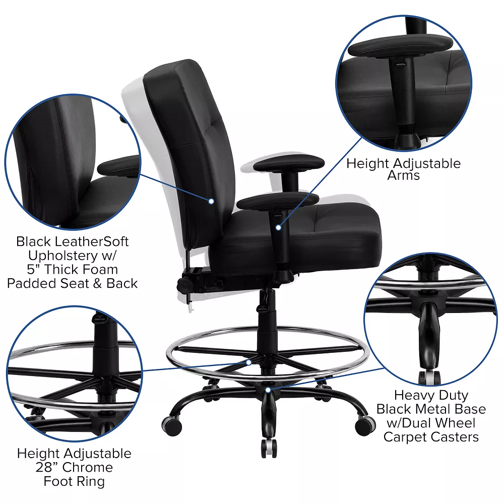 Draft chairs are essential for any profession where work surfaces are above standard height or for any job requiring employees to be at eye contact level with customers. This Big & Tall black fabric upholstered drafting chair is designed to accommodate larger and taller body types and has been tested to hold a capacity of up to 400 lbs., offering a broader seat and back width. The back height adjustment knob moves 3.25 up and down to position the lumbar support to reduce back pain. The locking back angle adjustment lever changes the angle of your torso to reduce disc pressure. The height adjustable arms relieve pressure from the back and shoulders while the height adjustable chrome foot ring promotes good posture. Chair easily swivels 360 degrees to get the maximum use of your workspace without strain. This modern chair is sure to make an impact whether it is used in the home or work field.
