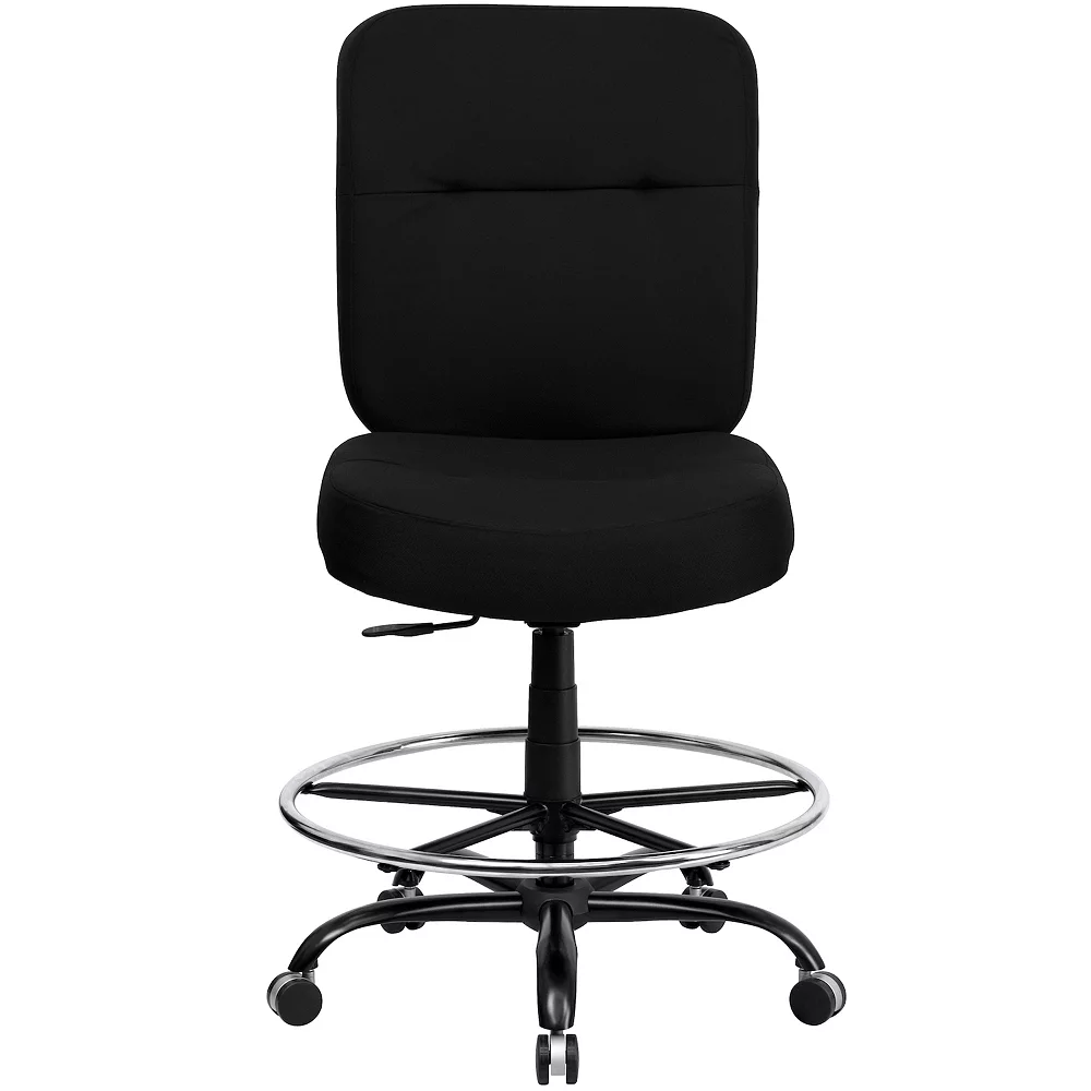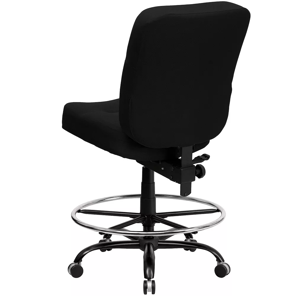 Big & Tall office chairs are designed to accommodate larger and taller body types. This chair has been tested to hold a capacity of up to 400 lbs., offering a broader seat and back width. The adjustable height back extends to the upper back for greater lumbar support. The locking back angle adjustment lever changes the angle of your torso to reduce disc pressure. This draft chair is essential for any profession where work surfaces are above standard height, such as lab technicians, architects, graphic artists, or any other creative assignment. They can also make a great chair for any job requiring employees to be at eye contact level with customers, such as receptionists or cashiers. Chair easily swivels 360 degrees to get the maximum use of your workspace without strain. The pneumatic adjustment lever will allow you to easily adjust the seat to your desired height. The chrome foot ring can also be adjusted to your height preference. The heavy duty steel base is constructed to withstand daily use.