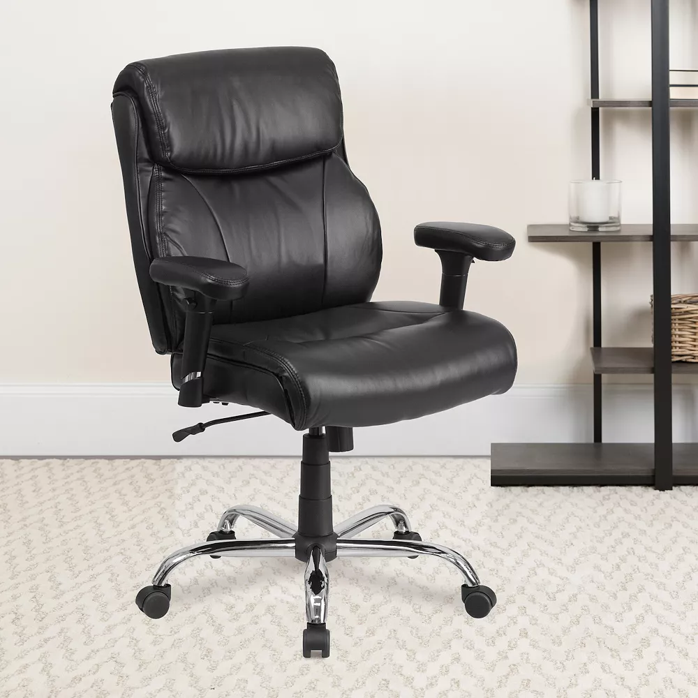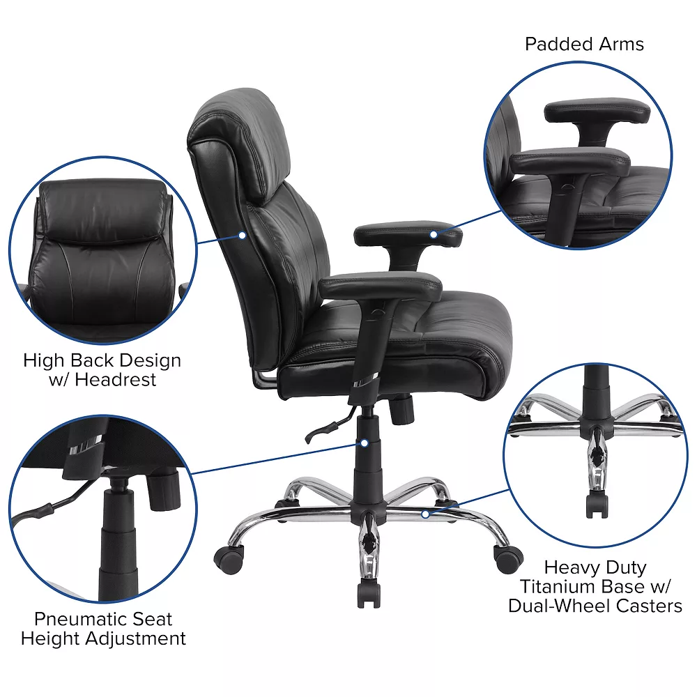 If your job or hobby requires you to sit for long stretches of time having the right chair is priceless. Big & Tall office chairs are designed to accommodate larger and taller body types. This chair has been tested to hold a capacity of up to 400 lbs., offering a broader seat and back width. A mid-back office chair offers support to the mid-to-upper back region. This office chair features black LeatherSoft upholstery and plenty of thick, plush padding to provide greater support. LeatherSoft is leather and polyurethane for added Softness and Durability. Turn the tilt tension adjustment knob to increase or decrease the amount of force needed to rock or recline. Lock the seat in place with the tilt lock mechanism. The waterfall front seat edge removes pressure from the lower legs. Chair easily swivels 360 degrees to get the maximum use of your workspace. The pneumatic adjustment lever will allow you to easily adjust the seat. The adjustable armrests take the pressure off the shoulders and the neck. The chrome base adds a stylish look to complement a contemporary office space.