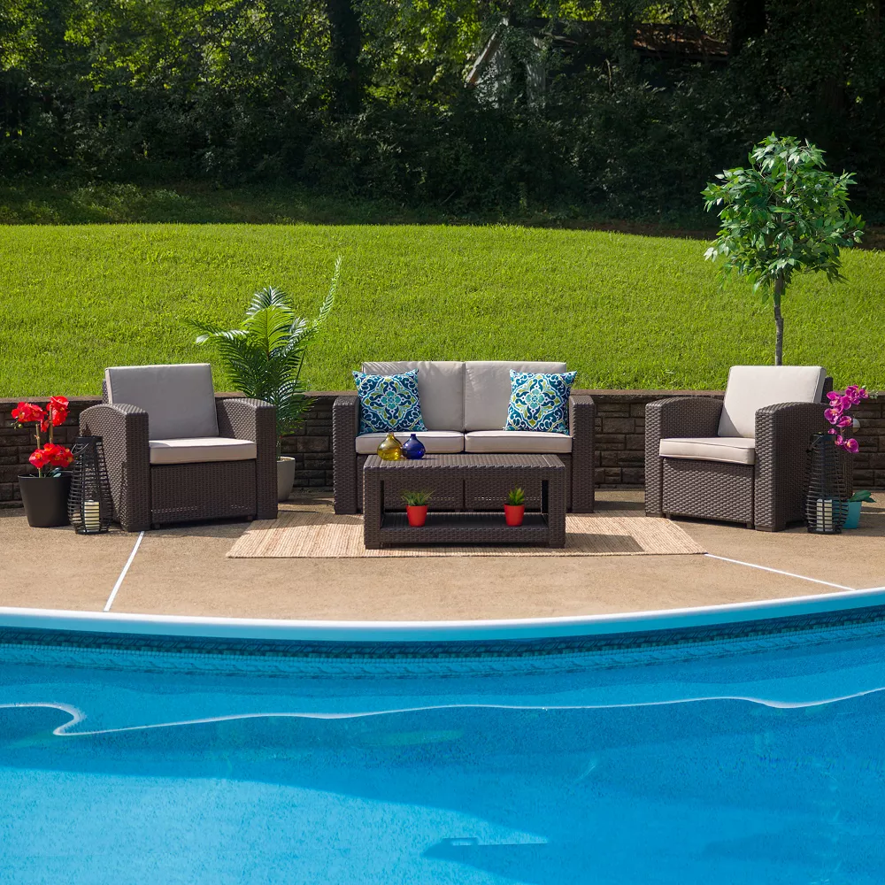 Surround yourself with loved ones and make those memories that last forever on this beautiful chocolate brown outdoor seating ensemble. The durable resin frame offers a stylish appearance which replicates rattan. Deep seating enhances the comfort level. Beige all-weather cushions will hold up all season long. Clean up spills with a water-based cleaner or the cushions are zipper removable for washing purposes when spot cleaning just isn’t enough. The table features a lower shelf for storage of your dining or relaxing essentials so just relax and let your worries go.