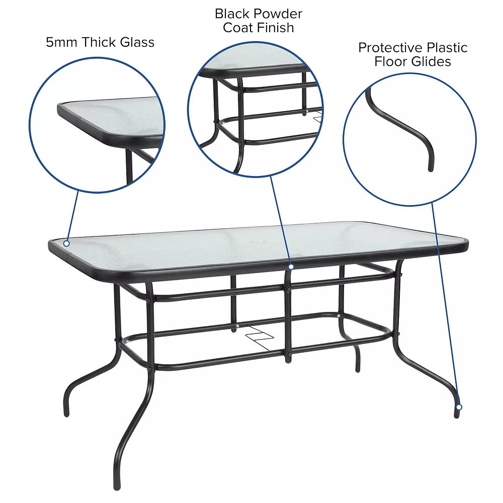 - 31.5″W x 55″D x 27.5″H Rectangular Table with Tempered Glass Top and Umbrella Hole; Holds 130 lbs. Static Weight
