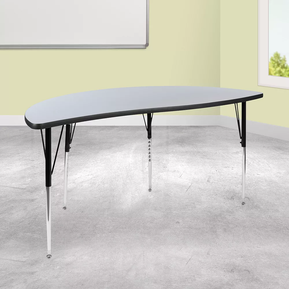 Bring group projects to the table on this collaborative wave activity table that’s designed to nest two or more wave activity tables together, but cool enough to use as a standalone classroom table. Wave classroom tables instantly modernizes your classroom to bring excitement to the learning environment. Students feel more encouraged to work in groups with furnishings designed for collaboration. Built to last through many class turnovers the thermal fused laminate top is scratch, stain and warp resistant. An attractive black powder coated finish protects the upper legs from scratches and height adjustable chrome lower legs give you the flexibility to raise or lower the table a full 9 in 1 increments. Self-leveling nylon floor glides keep the table from wobbling and protect your floor by sliding smoothly when you need to move it. Mix various shaped nesting activity tables around the classroom for better interaction between students as well as helping to define workspaces. This table accommodates four 16 or 18 seat ergonomic shell stack chairs. For the ultimate classroom setup add our soft seating collaborative circle and moon shaped ottomans to add color and safety. Collaboration doesn’t happen only in the classroom, add this office group table in your conference room or collaborative space for team members to gather around.