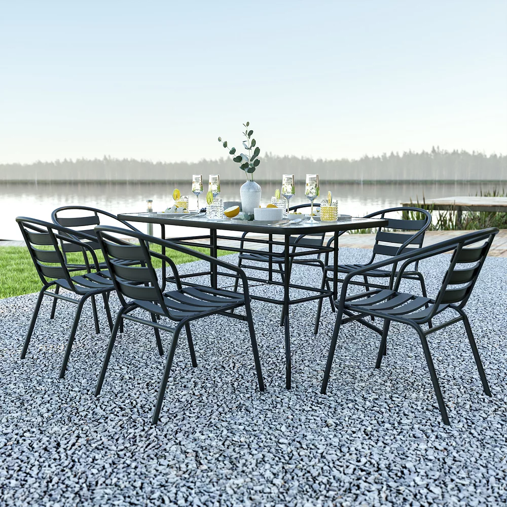 When you’re ready to host your next outdoor party or family BBQ, this seven piece patio dining set will provide the perfect place for your friends and family to come together. The 31.5 x 55 table features a metal frame and a tempered glass top with a smooth surface and designer rippled look. Complete with an umbrella hole, you can enjoy your outdoor space rain or shine by pairing with one of our 9′ patio umbrellas and a base. Six lightweight aluminum chairs with curved slat backs give your guests a comfortable place to sit and stack up to 22 high when not in use for easy storage. The chairs arrive ready to use while the table assembles in 30 minutes or less. The all weather materials are perfect for outdoor use, but for longevity, care should be taken to protect the set from extended periods of exposure to wet weather.