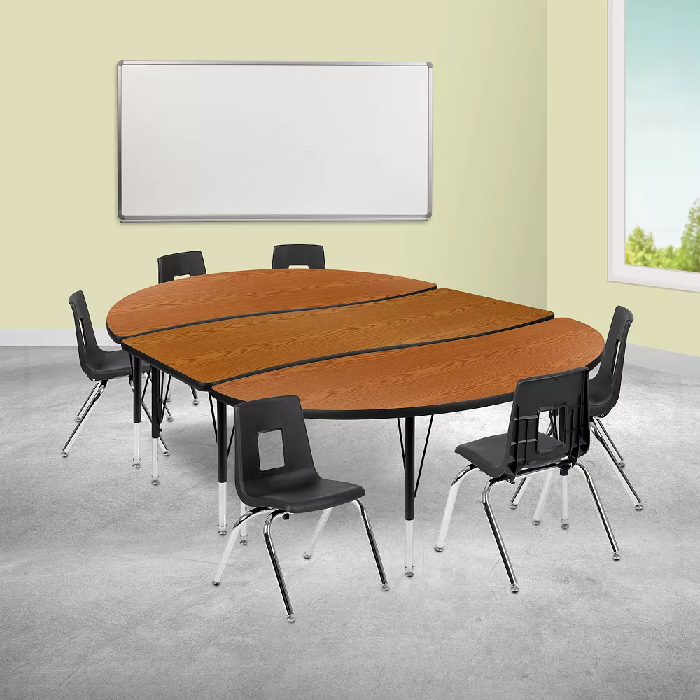 Prepare for a new year by incorporating these modern collaborative table sets in your classroom that are designed to encourage all students to participate in group learning. You can create unlimited combinations using various shapes and colors. With our ergonomic shell student chairs included there is no need to shop around. Practical for any class setting this school table group will last you for many years with its durable thermal fused laminate top that is scratch, stain and warp resistant. Height adjustable chrome lower legs give you the flexibility to raise or lower the table. Self-leveling nylon floor glides keep the table from wobbling and protect your floor by sliding smoothly when you need to move it. Purchase our pre-built table and chair bundle for your classroom, daycare, Sunday school or home. The plastic stack chairs with 14 seat height are ideal for kindergarteners through 3rd grade students.