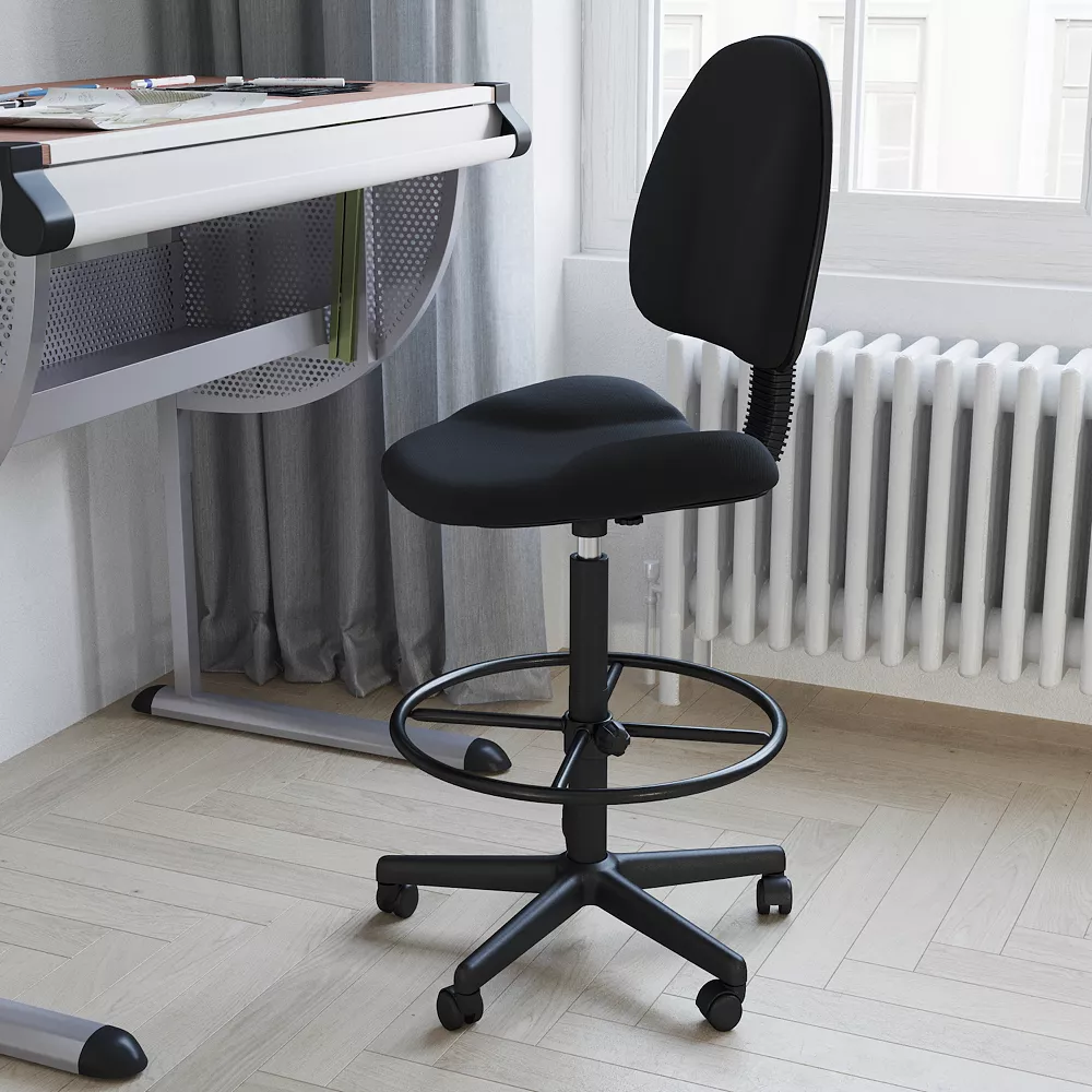 If you sit for long hours throughout the day you may benefit from this black pin dot patterned fabric upholstered drafting chair. Draft chairs are essential for any profession where work surfaces are above standard height, such as lab technicians, architects, graphic artists, or any other creative assignment. They can also make a great chair for any job requiring employees to be at eye contact level with customers, such as receptionists or cashiers. This chair was designed to support the mid-to-upper back region. Chair easily swivels 360 degrees to get the maximum use of your workspace without strain. The pneumatic adjustment lever will allow you to easily adjust the seat to your desired height. The foot ring can also be adjusted to your height preference for added comfort. This versatile chair is sure to make an impact whether it is used in the home or at the office.