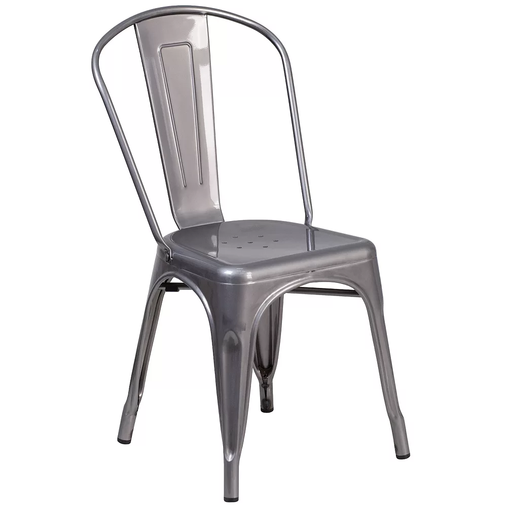 Instantly add an urban look and feel to your dining area with this clear coated stackable metal chair with vertical slat back. This chair’s curved, vertical slat back provides firm spinal support and ensures guests are at a comfortable height to enjoy your signature drinks, appetizers, entrees and desserts. Additionally, its flat, drain hole seat is easy to clean which is a must in the hospitality industry. Made of sturdy metal, this chair is durable enough to withstand years of use. An under-seat cross brace provides additional stability while the lightweight design allows for easy movement and transportation. This metal dining chair can be stacked up to 15 high when you need to clean the floors or for storage when not in use. Plastic caps on the cross brace protect the finish when stacked. Add this bistro style chair anywhere you want a sleek, modern look.