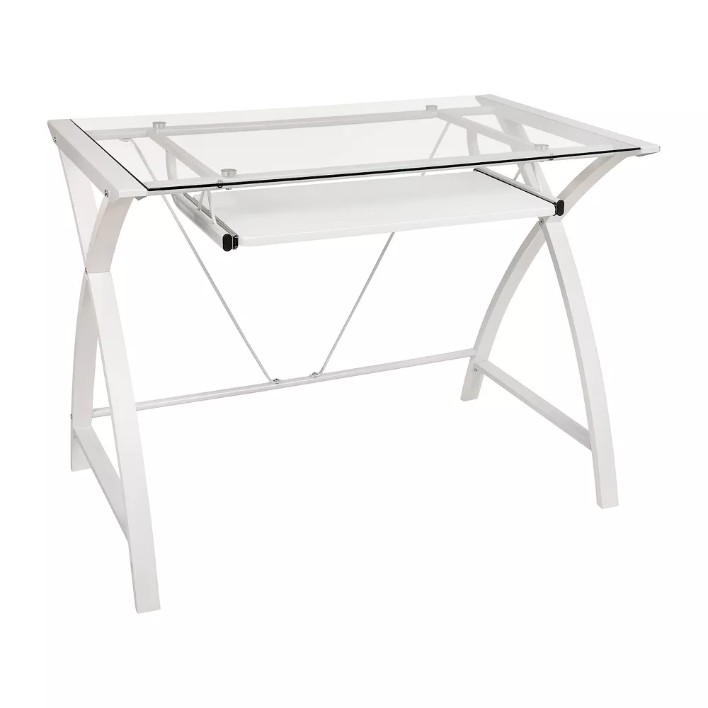 Brighten up your day, and your workspace, with the clean, contemporary look of this office computer desk. The beautiful detailing and smart design give you a compact workstation that will fit in small areas like living rooms, bedrooms and temporary home offices. The ample surface area gives you room to use your computer, do your paperwork and display family photos. Featuring a clear tempered glass surface, a space-saving, white sliding keyboard tray, and crisscross white finished legs this computer office desk would be an asset in any environment. Sturdiness and durability are essential elements of any piece of furniture and this glass computer desk is more than just a pretty face. The 5mm tempered glass top surface combined with the mix of steel and wood construction gives this rectangular desk a robust design that will hold up to 110 lbs. static weight capacity to accommodate your work setup. A powder coated finish protects the frame from scratches and floor glides protect your floor by sliding smoothly when you need to move the desk. This mixed media computer desk offers a practical option when you don’t have a lot of space in your dorm room, home office or for a designated study area. Spills clean up quickly with a water based cleaner.