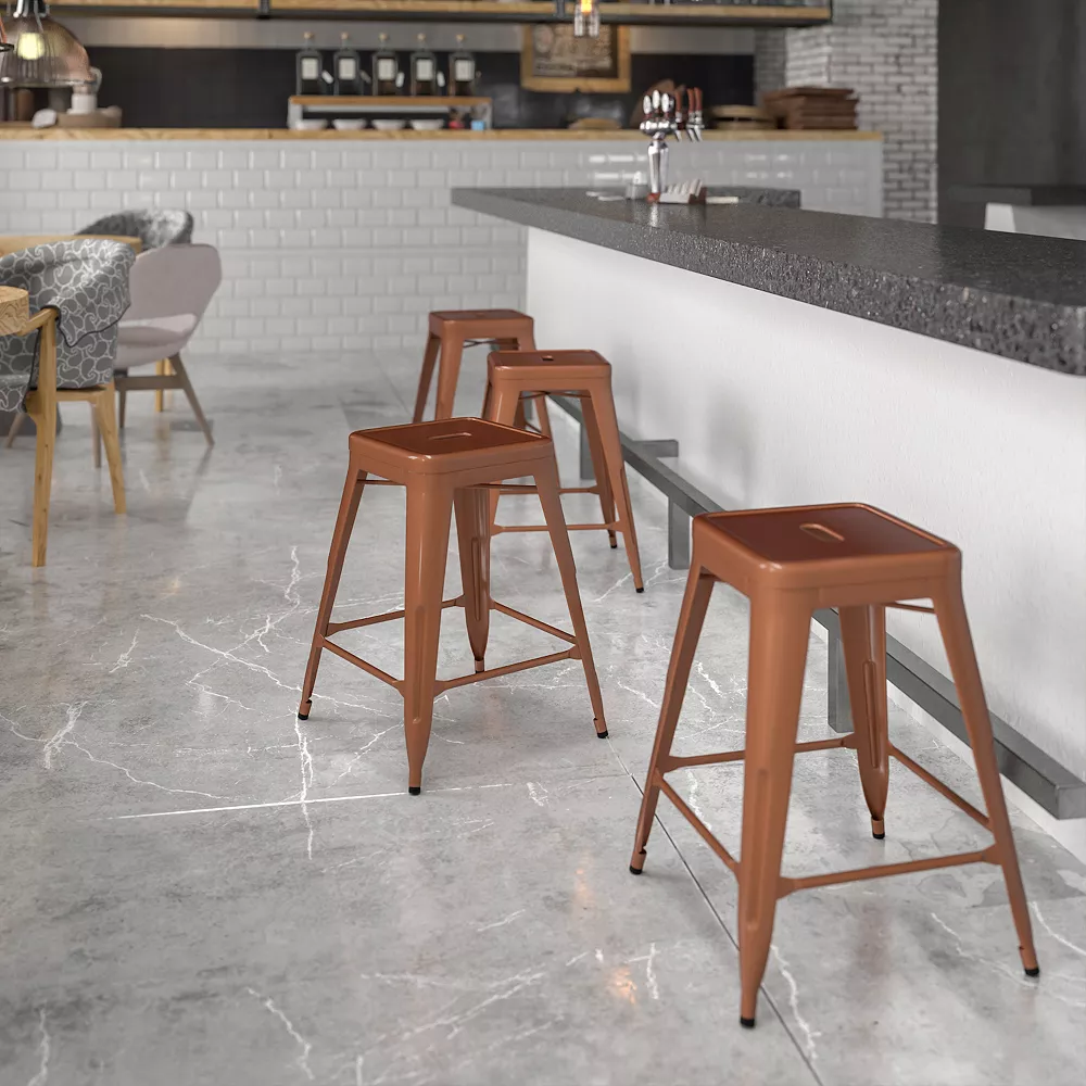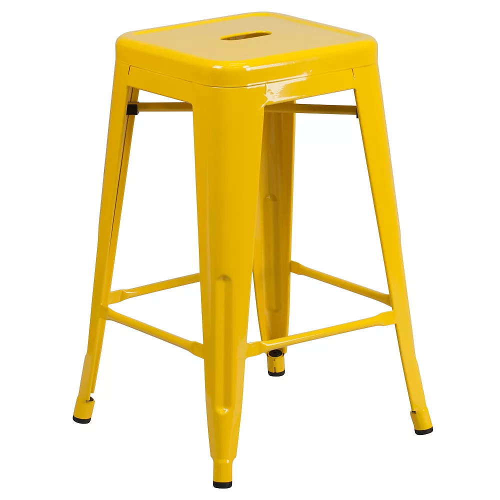 Upgrade the seating in your restaurant, eatery or home with this colorful counter stool with growing popularity. This space-saving stool is stackable making it great for storing. This stool features a backless, lightweight design that allows easy movement from inside areas to the patio or sidewalk to enjoy nice weather. A cross brace underneath the seat adds extra stability and features plastic caps that prevent the finish from scratching when stacked. The legs have protective floor glides that prevent damage to flooring. This all-weather use stool is great for indoor and outdoor settings. For longevity, care should be taken to protect from long periods of wet weather. The unique design of this backless stool gives it the versatility to be used in multiple spaces.