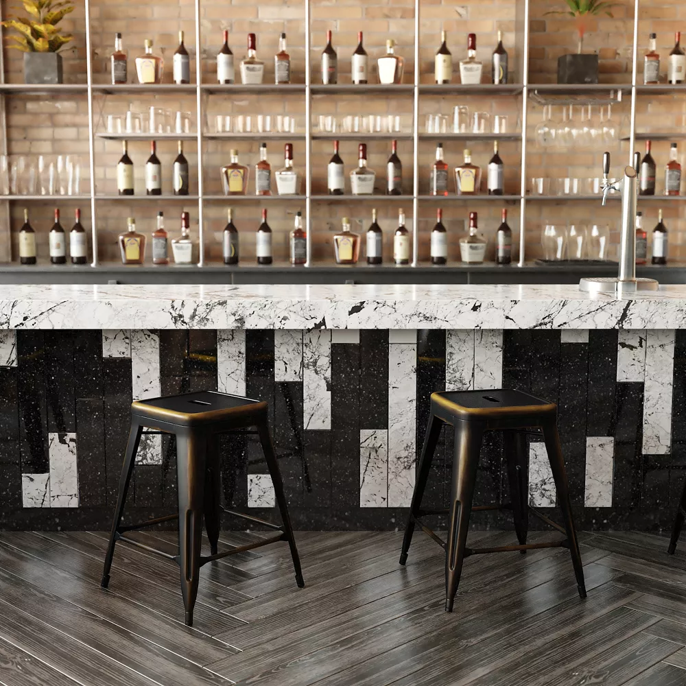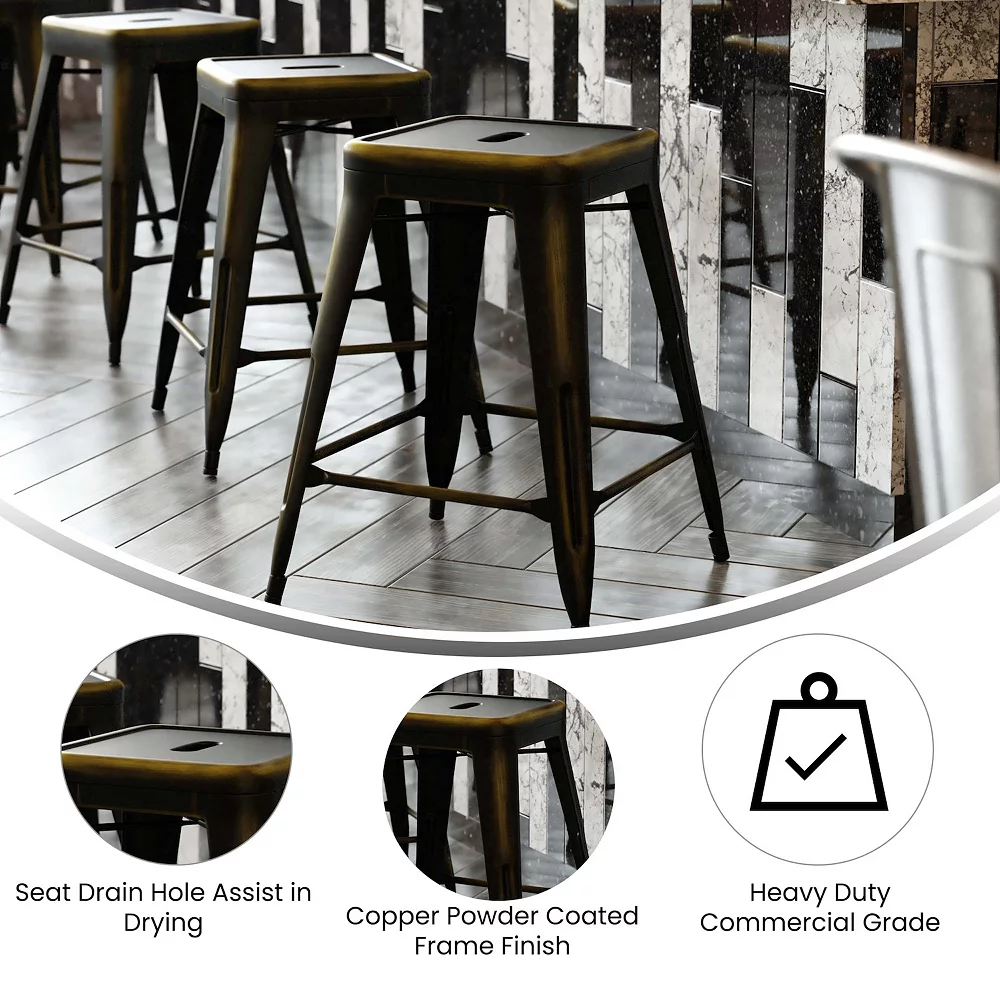 Be daring in your decorating scheme and let the clean lines of this metal, indoor-outdoor, backless counter stool add a classic industrial look to your kitchen island or counter. You’ll be pleasantly surprised how well these distressed metal counter stools blend in with your existing furnishings. Create a cool hangout spot for millennials by pairing our counter height stools with a wall bar top. Constructed to hold up in commercial settings, this dining counter stool will instantly modernize your restaurant, cafe, or bar by adding splashes of color. Mix and match colors and chair heights to make your place look cohesive. The lower support braces double as a footrest, promoting proper posture and an improved sitting experience. Create your own breakfast nook in the kitchen, complete your entertainment room in the basement or update the employee breakroom with this colorful dining stool. This timeless counter height bar stool includes drain holes to prevent water from pooling in the center of the seat. For longevity, care should be taken to protect from long periods of wet weather.