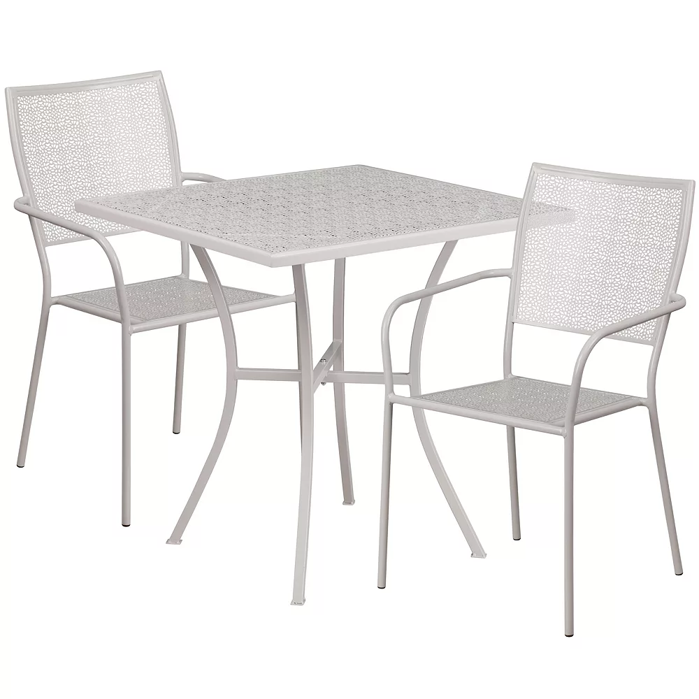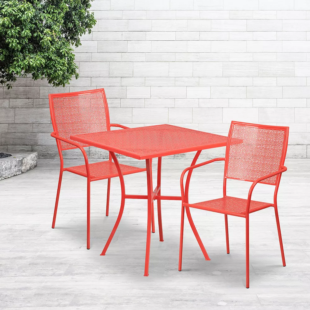 Brighten up your patio space with this beautiful patio table set. This colorful set will enhance your bistro, cafe, restaurant, hotel or home patio space. The patio chairs stack for storing. The frames are designed for all-weather use making it a great option for indoor and outdoor settings. For longevity, care should be taken to protect from long periods of wet weather. The possibilities are endless with the multitude of environments in which you can use this table, for both commercial and residential spaces.