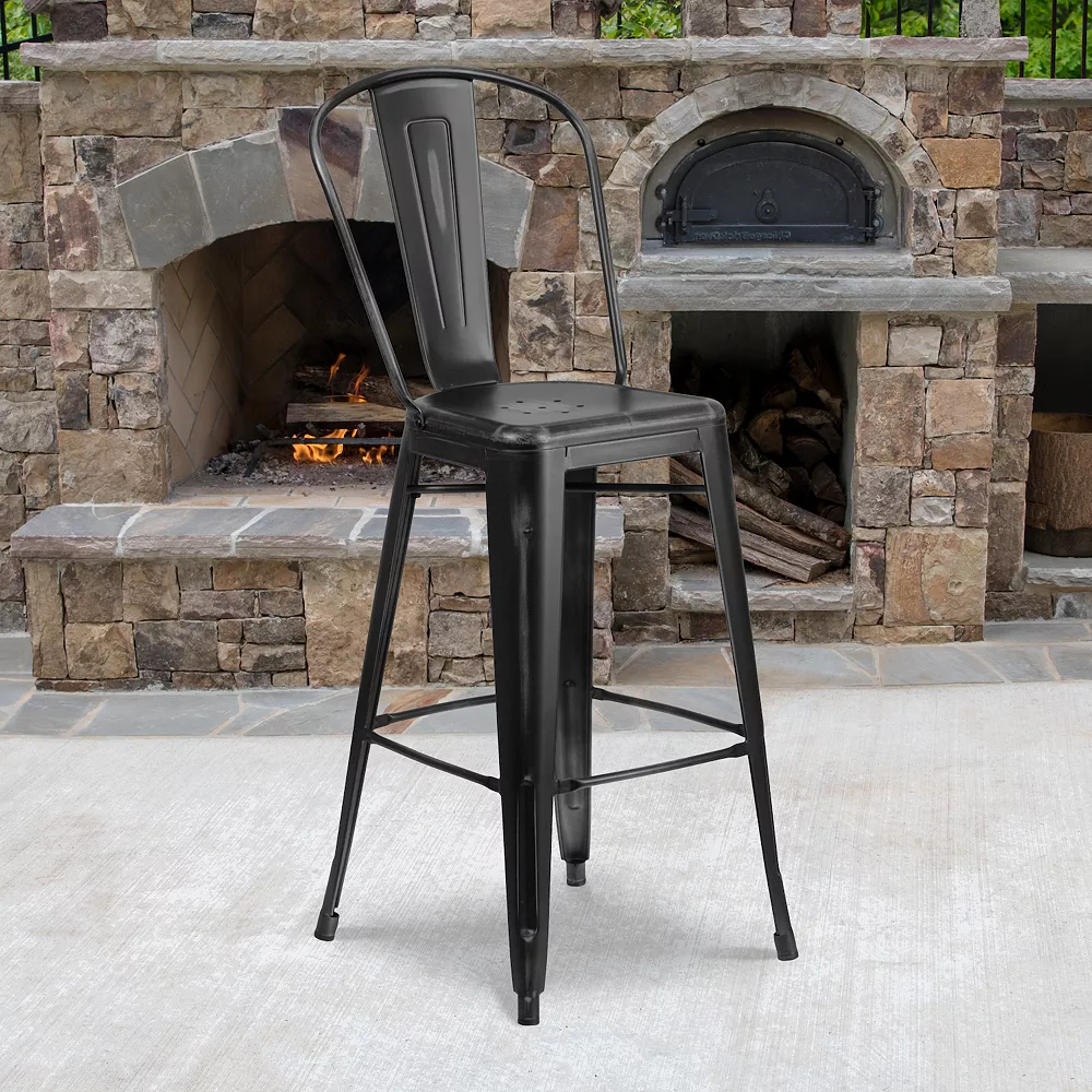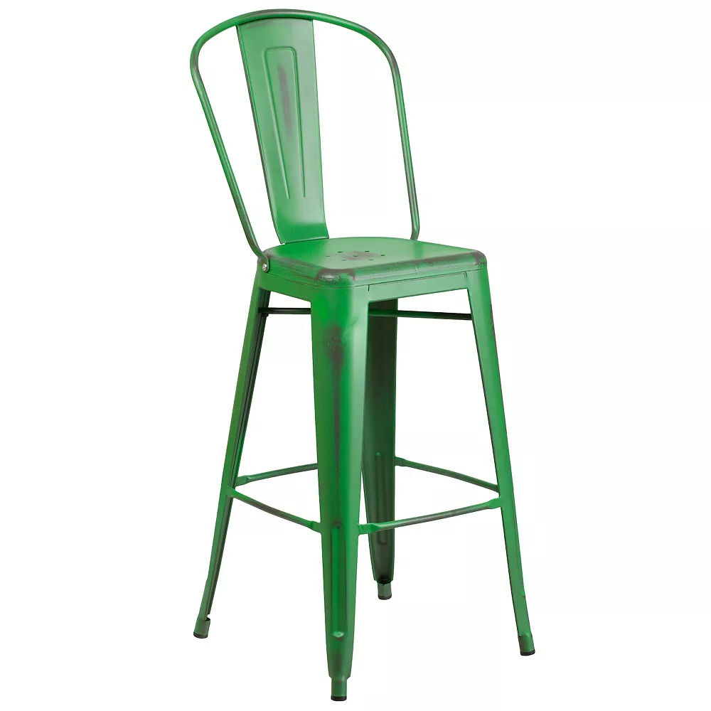 Create an eclectic look around your pub height dining room table or a set up a cozy space in your kitchen to enjoy a cup of joe and light breakfast with this distressed dining stool. You’ll be pleasantly surprised how well these distressed metal bar stools blend in with your existing furnishings. Durably constructed, this bar height stool will instantly modernize your restaurant, cafe, or bar by adding splashes of color. Metal barstools with backs provide a comfortable sitting experience, the full back is ergonomically curved and includes a vertical slat. The lower support braces double as a footrest, promoting proper posture. Drain holes prevent pooling in the center of the seat for a faster turn around to seat customers. For longevity, care should be taken to protect from long periods of wet weather. Whether it’s time to update your employee breakroom with some colorful furniture or add some durable seating to your patio furniture collection, this timeless indoor outdoor bar stool delivers.
