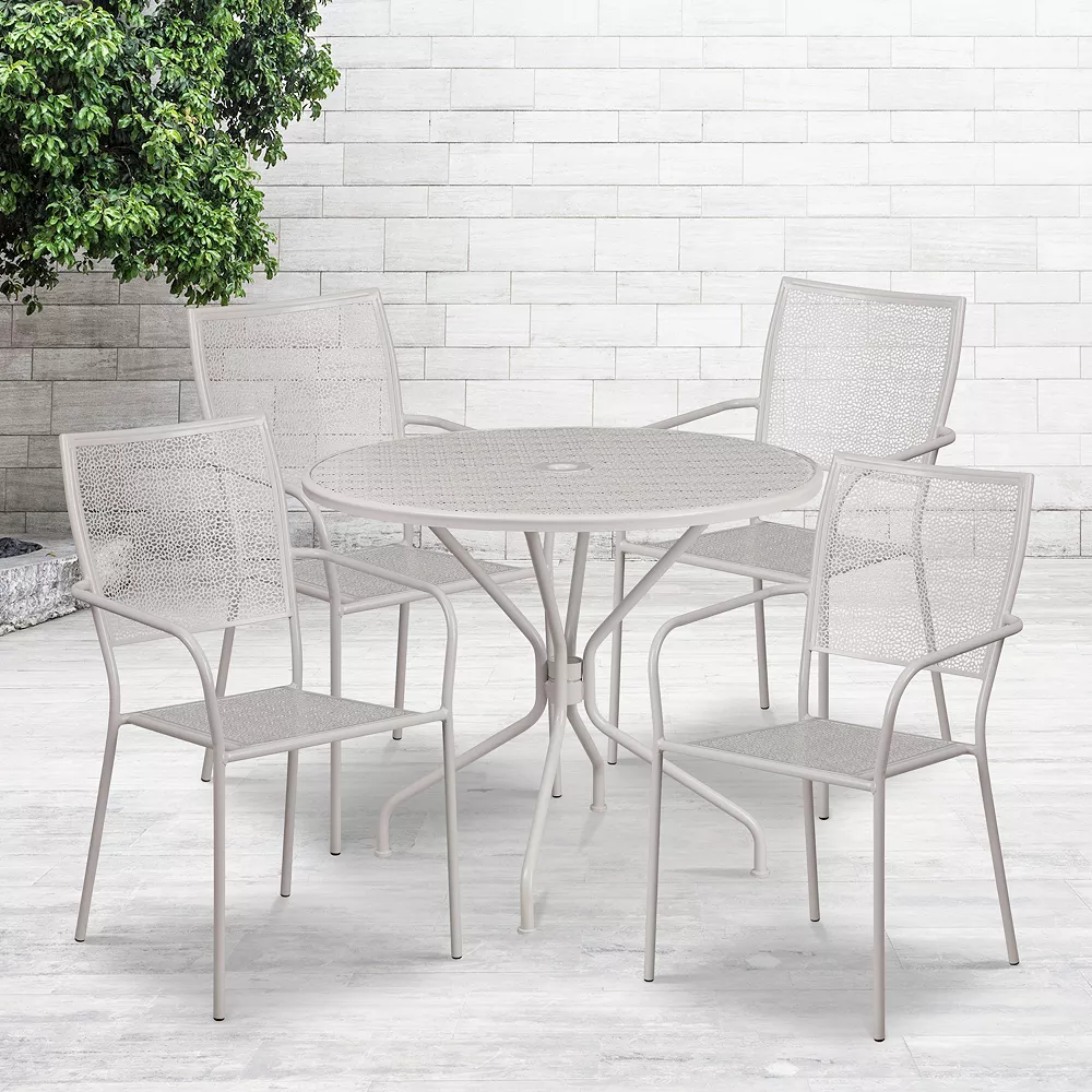 Brighten up your patio space with this beautiful patio table set. This colorful set will enhance your bistro, cafe, restaurant, hotel or home patio space. The top includes an umbrella hole (umbrella not included). The patio chairs stack for storing. The frames are designed for all-weather use making it a great option for indoor and outdoor settings. For longevity, care should be taken to protect from long periods of wet weather. The possibilities are endless with the multitude of environments in which you can use this table, for both commercial and residential spaces.