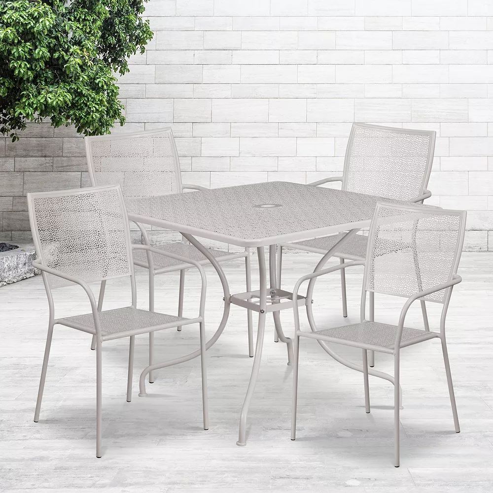 Brighten up your patio space with this beautiful patio table set. This colorful set will enhance your bistro, cafe, restaurant, hotel or home patio space. The top includes an umbrella hole (umbrella not included). The patio chairs stack for storing. The frames are designed for all-weather use making it a great option for indoor and outdoor settings. For longevity, care should be taken to protect from long periods of wet weather. The possibilities are endless with the multitude of environments in which you can use this table, for both commercial and residential spaces.