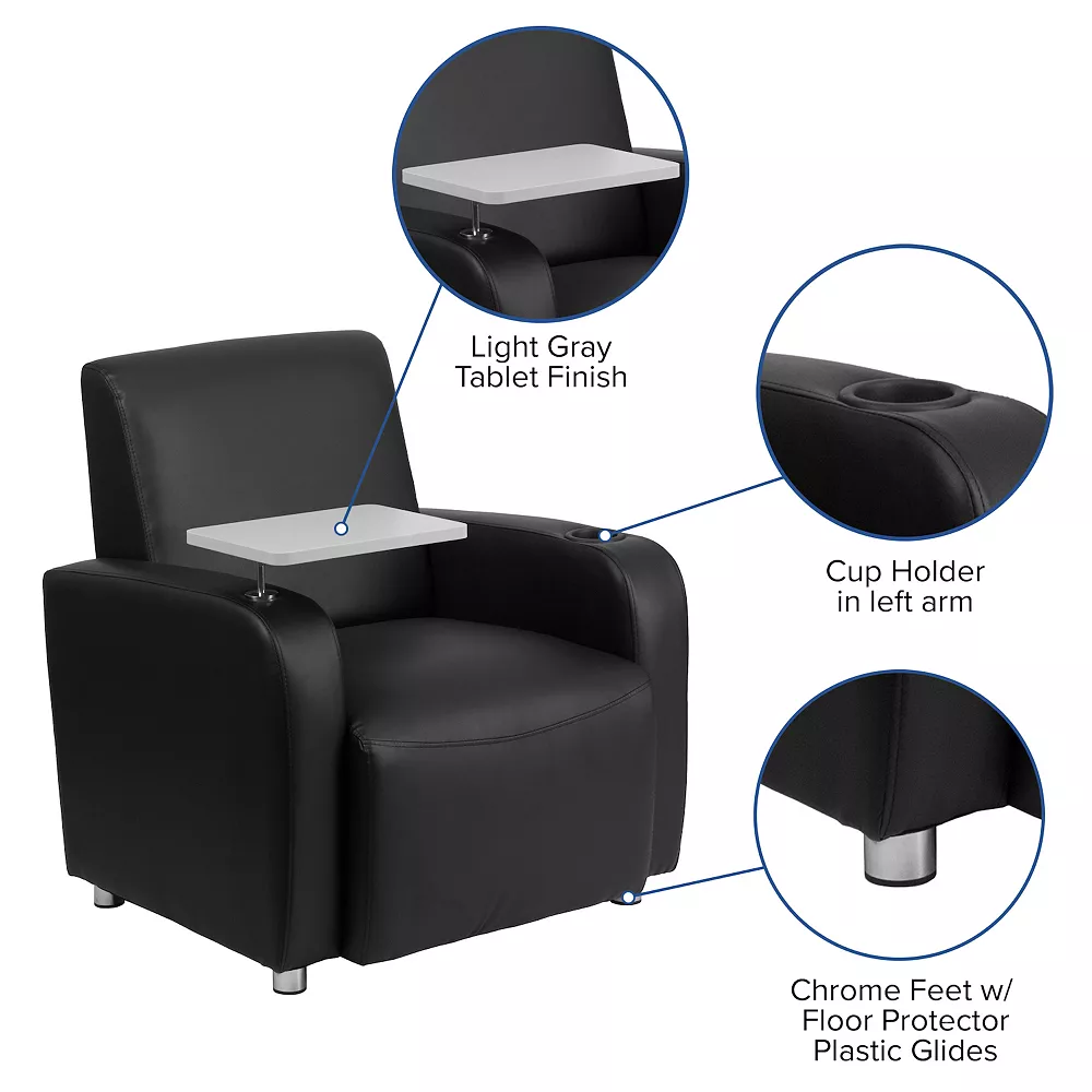 Welcome your visitors and colleagues with this gray LeatherSoft guest chair with tablet arm. The chair has a plush seat with foam padding and features a tablet arm for working on a laptop or completing paperwork. The tablet arm swings a full 360 degrees to position it at the ideal angle. A built-in cup holder keeps hands free for writing or typing while minimizing the possibility for spills. Sturdy, chrome legs are capped with plastic floor glides to protect your floor by sliding smoothly when you move it. Whether you’re creating a dedicated study space for a college or library or a productive space for visitors to wait, this attractive chair is an excellent choice.