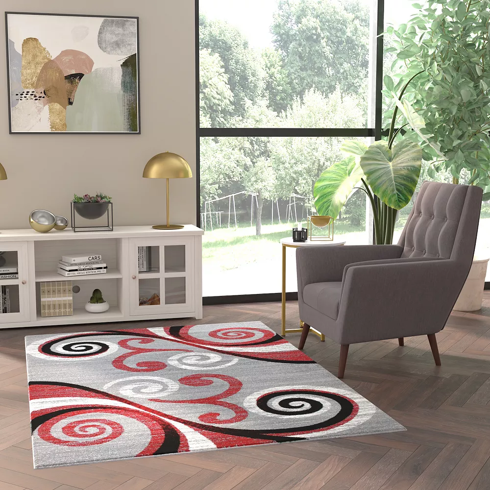 When your home is in need of a change, laying down an area rug can change the whole look of any room. This accent rug offers an ultra soft plush pile in gray with scraped look red, black and white swirls that give a hand painted, well loved feel. The olefin facing is naturally moisture and stain resistant, colorfast and non-shedding, perfect for a home with children and pets. The jute backing is suitable for multiple flooring types. With low maintenance care, you’ll be able to enjoy your rug without having to constantly worry about spills or messes. Simply vacuum regularly and spot clean when needed with a diluted mixture of clear, neutral detergent and water and a dry cloth. For heavier messes, the rug can be steam cleaned but should not be exposed to excessive moisture.