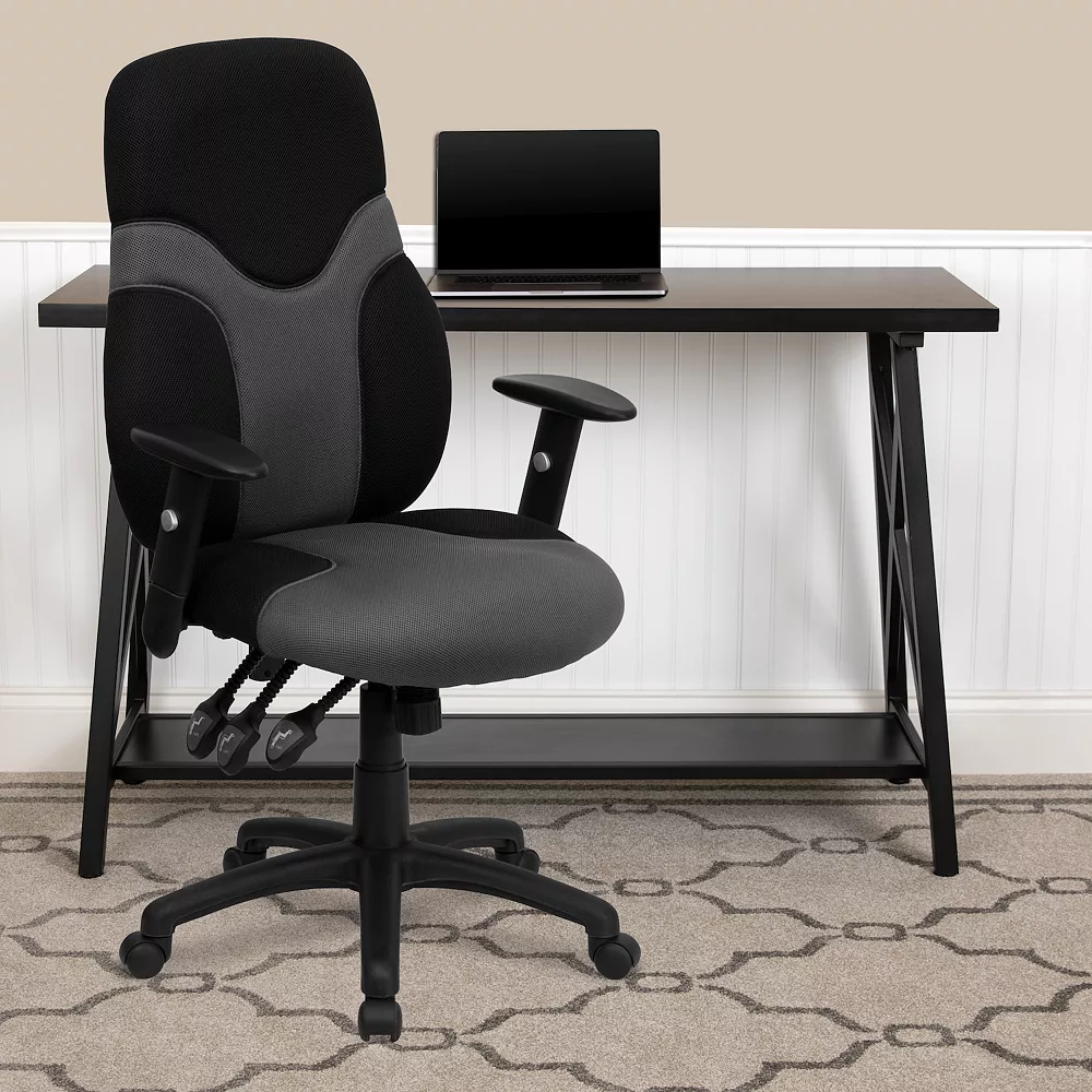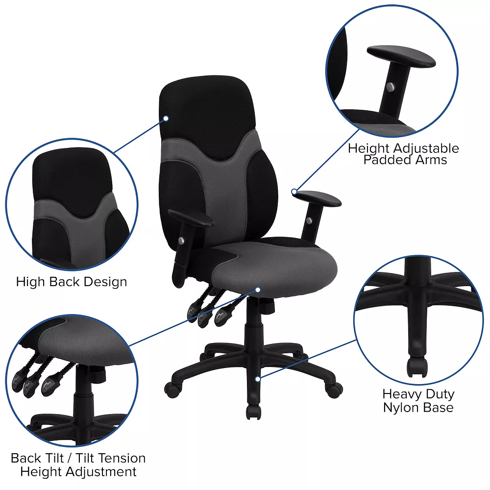 This multi-functional task office chair will give you an edge on comfort with its design and adjusting capabilities. Chair is attractively designed with its two-tone mesh upholstery that is seamlessly outlined in the seat and back of the chair. High back office chairs extend to the upper back for greater support and relieve tension in the lower back, preventing long term strain. The infinite-locking back angle adjustment lever changes the angle of your torso to reduce disc pressure. The multi-tilt lock mechanism rocks/tilts and locks the chair in infinite positions while the tilt tension adjustment knob adjusts the chair’s backward tilt resistance. Chair easily swivels 360 degrees to get the maximum use of your workspace without strain. The pneumatic adjustment lever will allow you to easily adjust the seat to your desired height. The height adjustable armrests take the pressure off the shoulders and the neck.